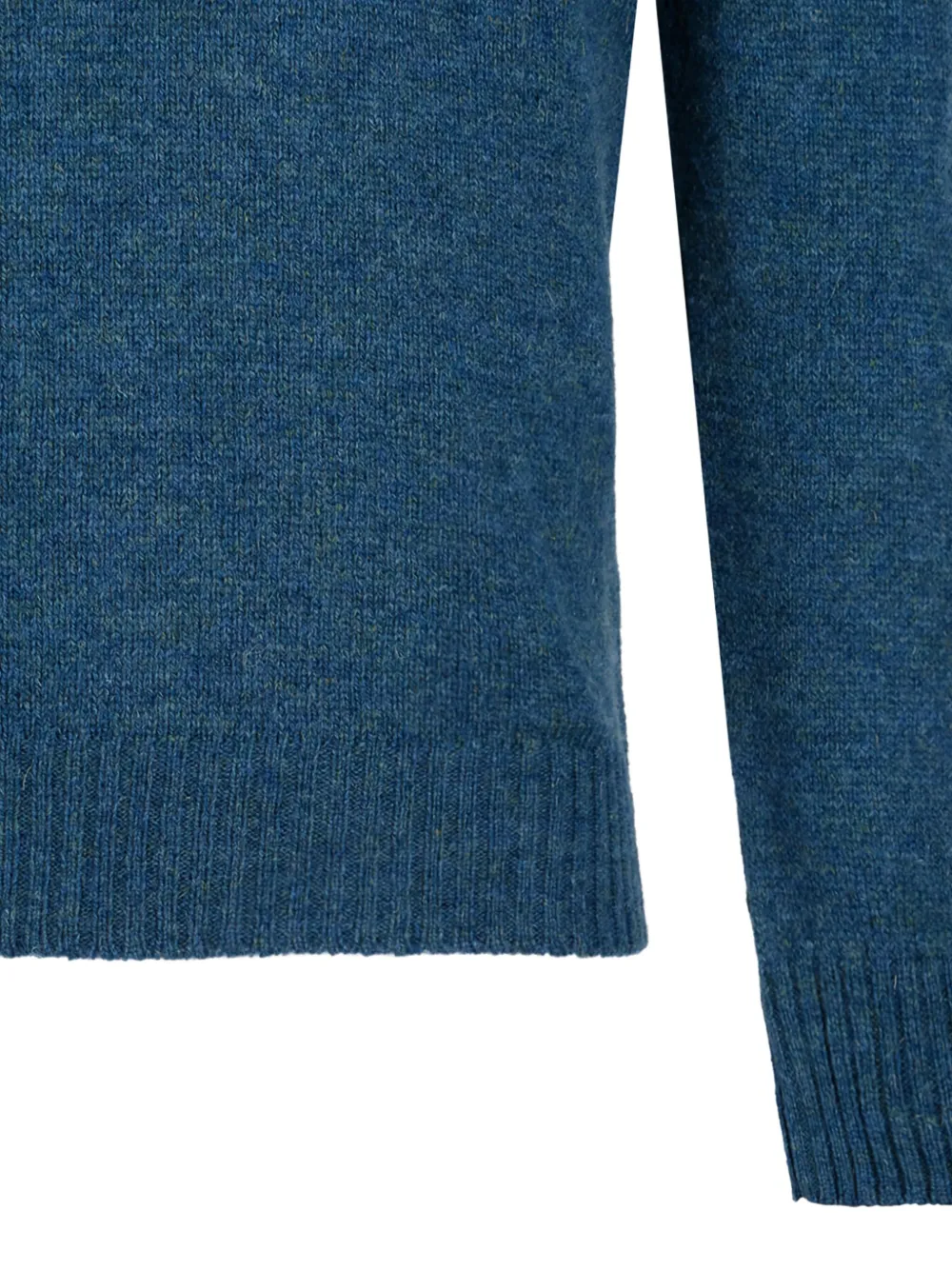 Ребристые манжеты цвета морской волны, ребристый подол, круглый вырез горловины, длинные рукава, гладкая вязка