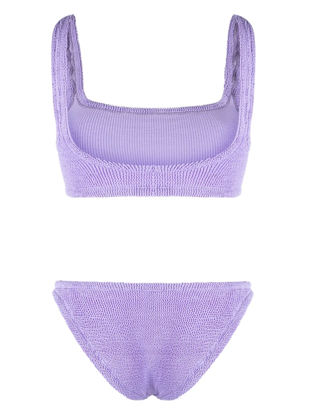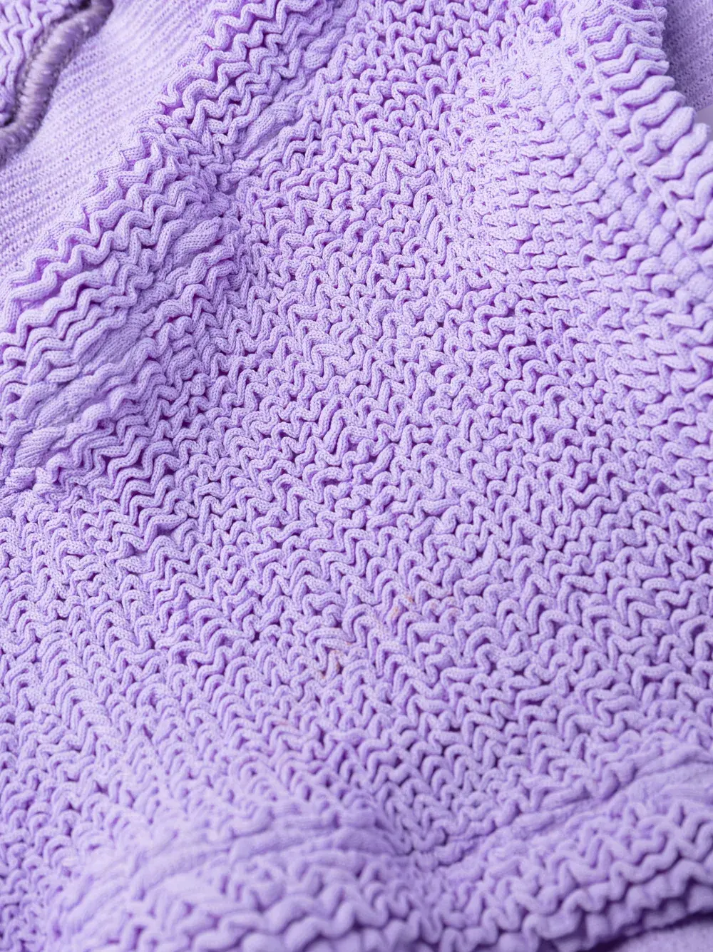 Подробнее о товаре: Фиолетовый, эластичный материал, жатый эффект, квадратный вырез, узкие бретели, без рукавов, U-образный вырез на спине, классические плавки бикини, средняя посадка и эластичный пояс. Пожалуйста, примеряйте купальники и пляжные шорты только поверх собственного белья. Узнать больше о том, какие товары получают отметку «Ответственный выбор», можно из материала «Как мы оцениваем экологичность и этичность».