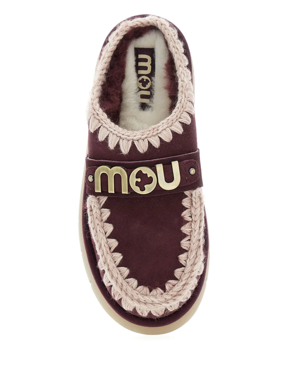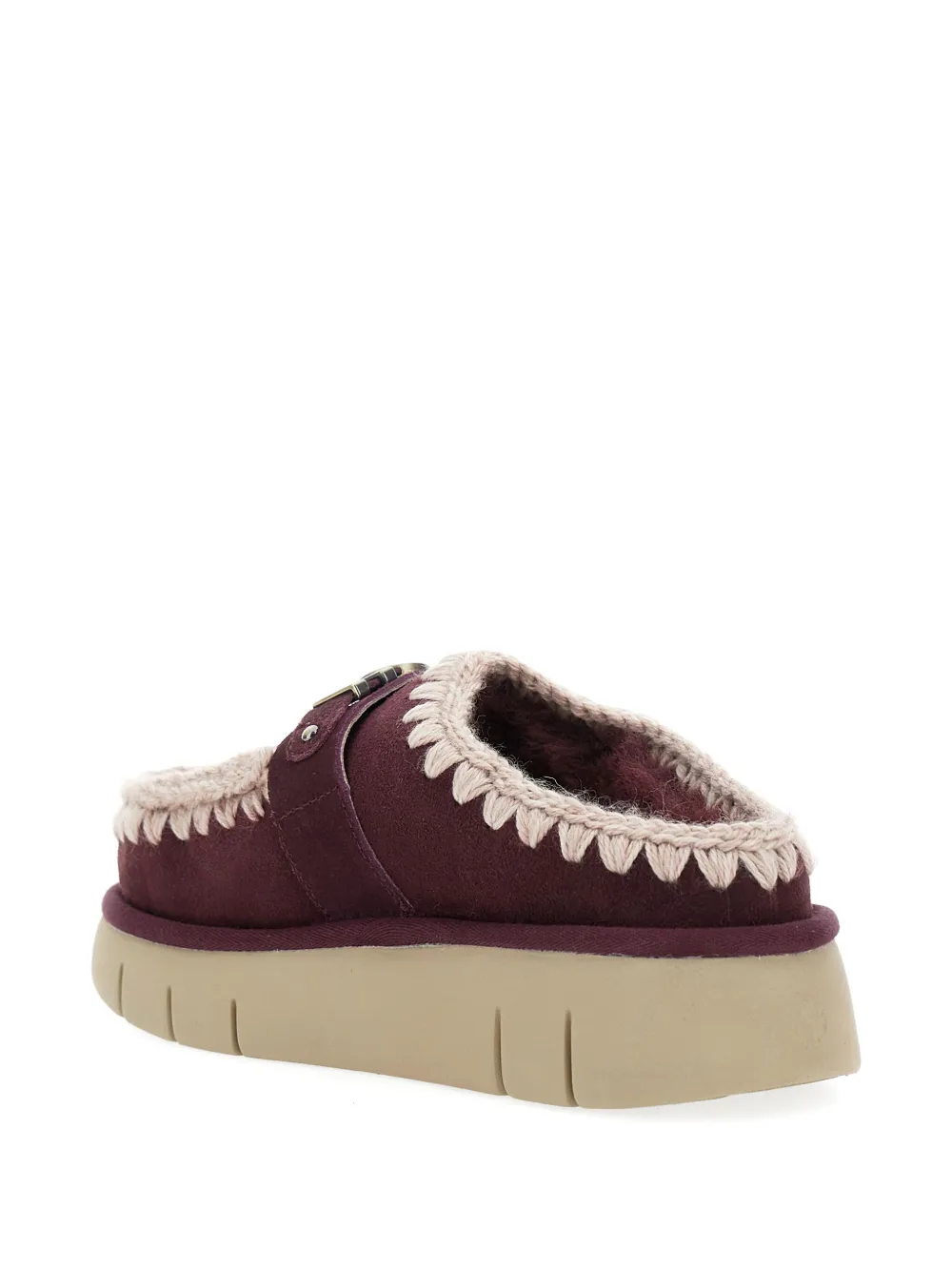 Верх из бордовой замши, отделка крючком, логотип, пряжка, подошва на платформе, подкладка из овчины