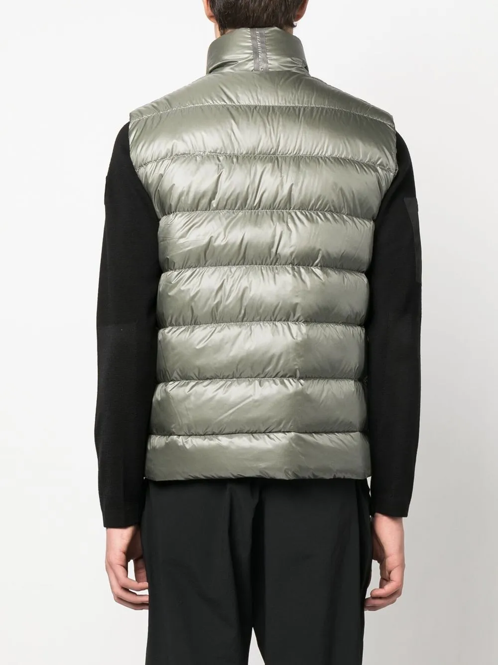 Серо-зеленый, наполнитель из пуха и перьев, дутый материал, отделка лентой с логотипом, нашивка с логотипом на груди, высокий воротник, двусторонняя молния спереди, без рукавов, прямой подол и два передних кармана с листочкой.