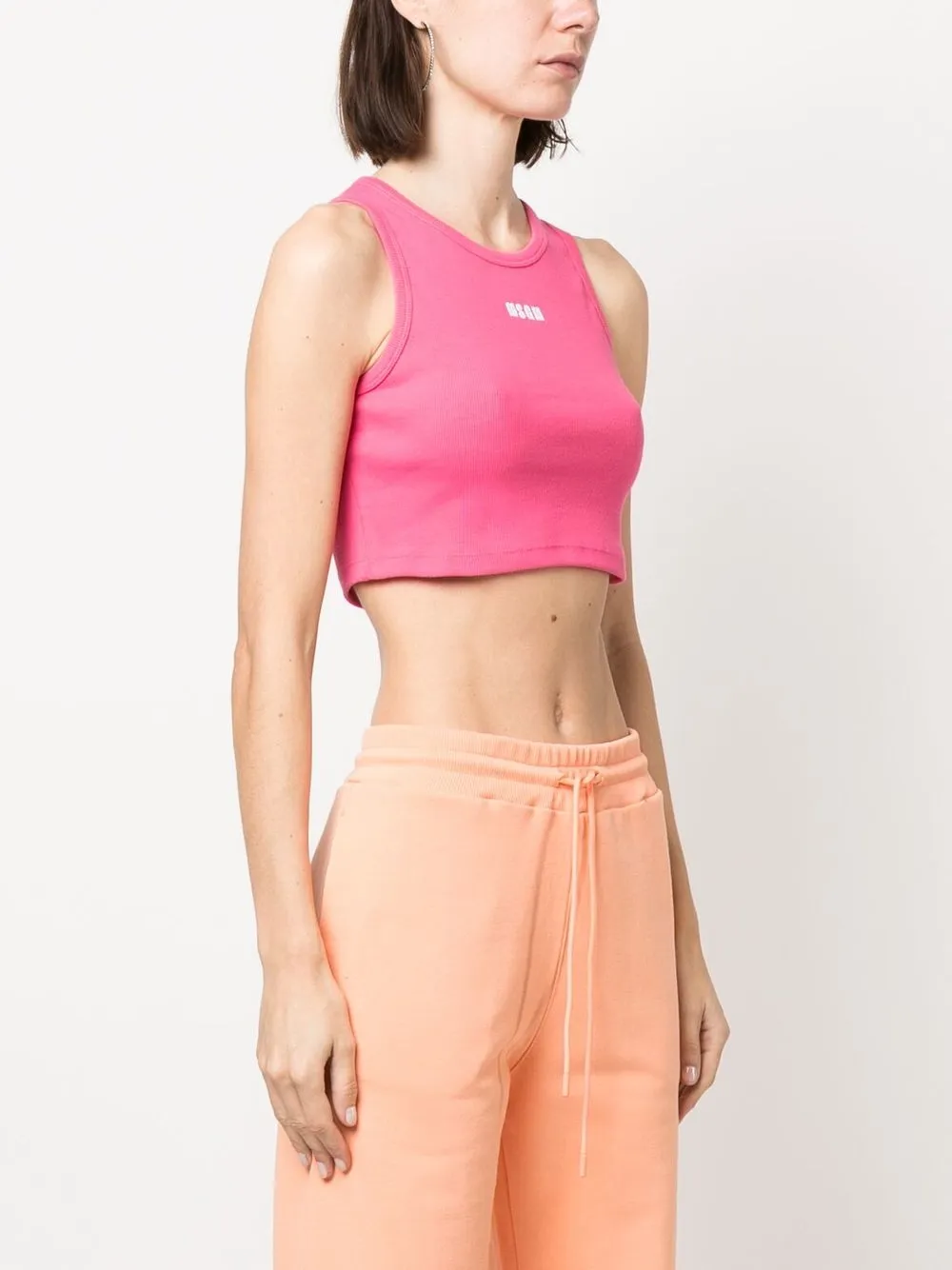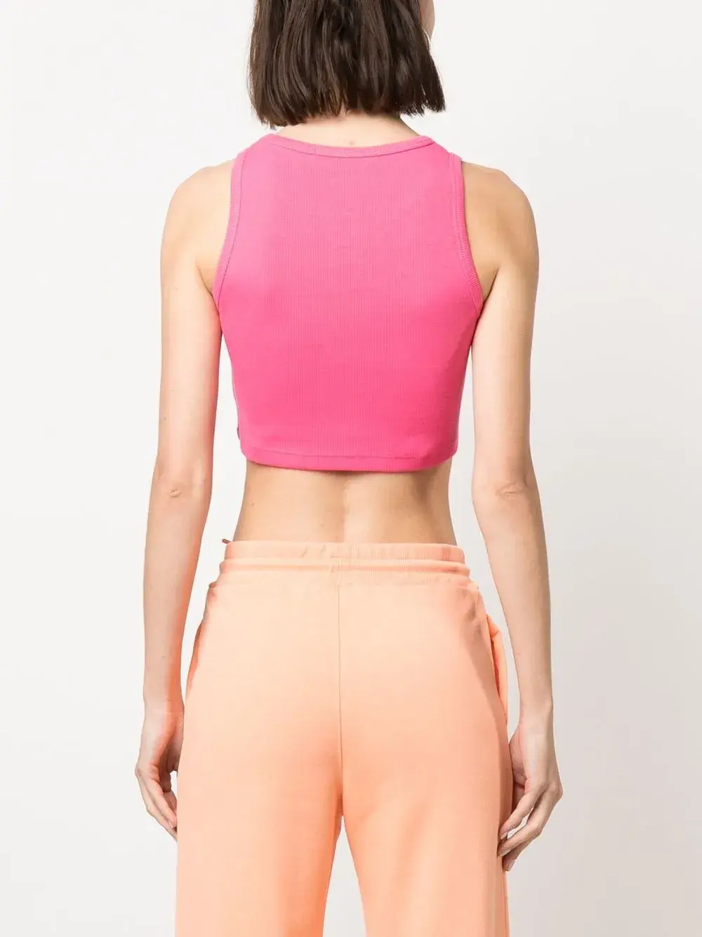 Розовый, эластичный хлопок, логотип спереди, круглый вырез, без рукавов и укороченная длина.