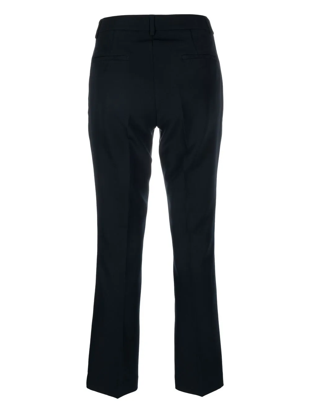 Темно-синий, завышенная талия, потайная застежка спереди, ширинка на молнии, петли для ремня, прорезные карманы по бокам, стрелки, два кармана с листочкой сзади и расклешенные манжеты.