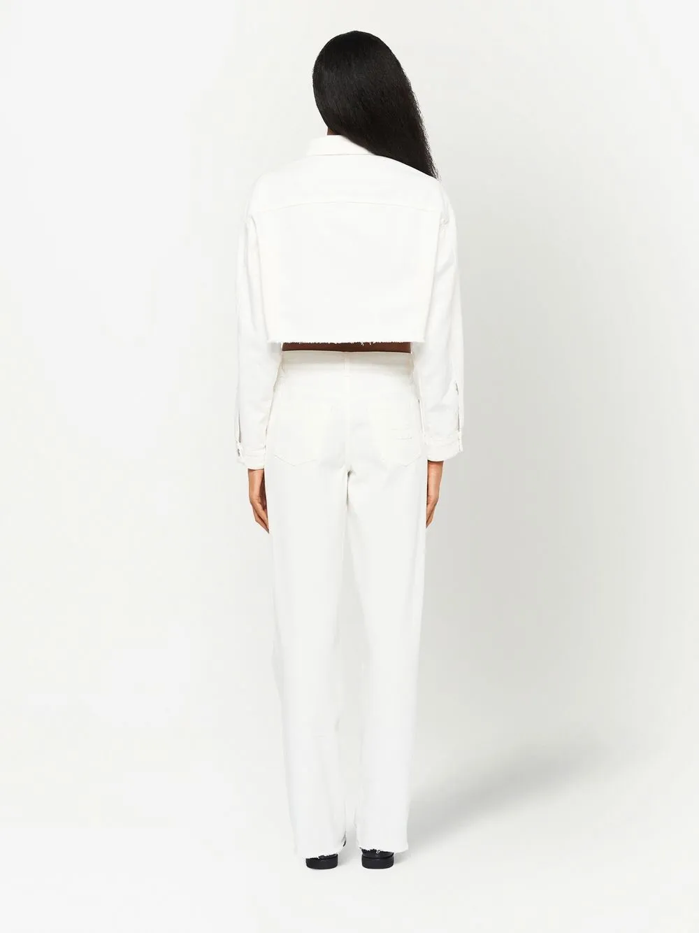 Белый, хлопок, вышитый логотип на груди, прямой воротник, застежка на пуговицах спереди, приспущенные плечи, длинные рукава, необработанный подол и укороченная длина.