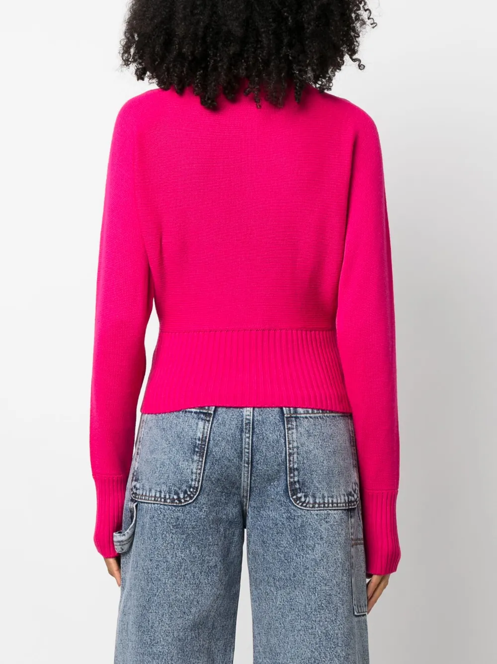 Фуксия, смесовая необработанная шерсть, трикотажный материал, отделка в рубчик, украшения из горного хрусталя, круглый вырез, длинные рукава и прямой подол.