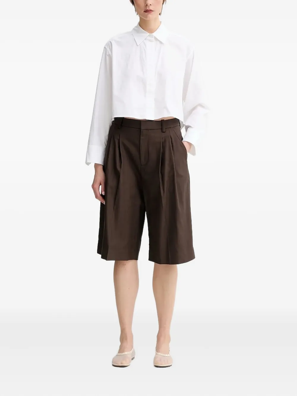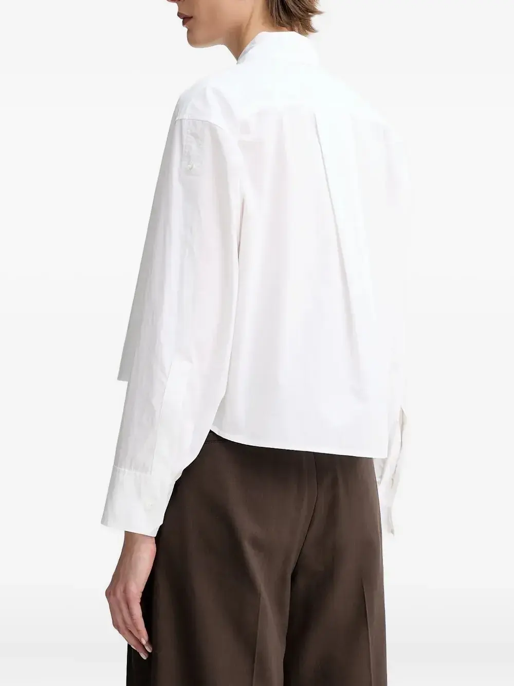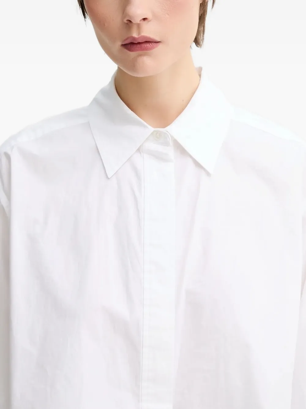 Белая застежка на пуговицы, воротник-стойка, манжеты на рукавах.