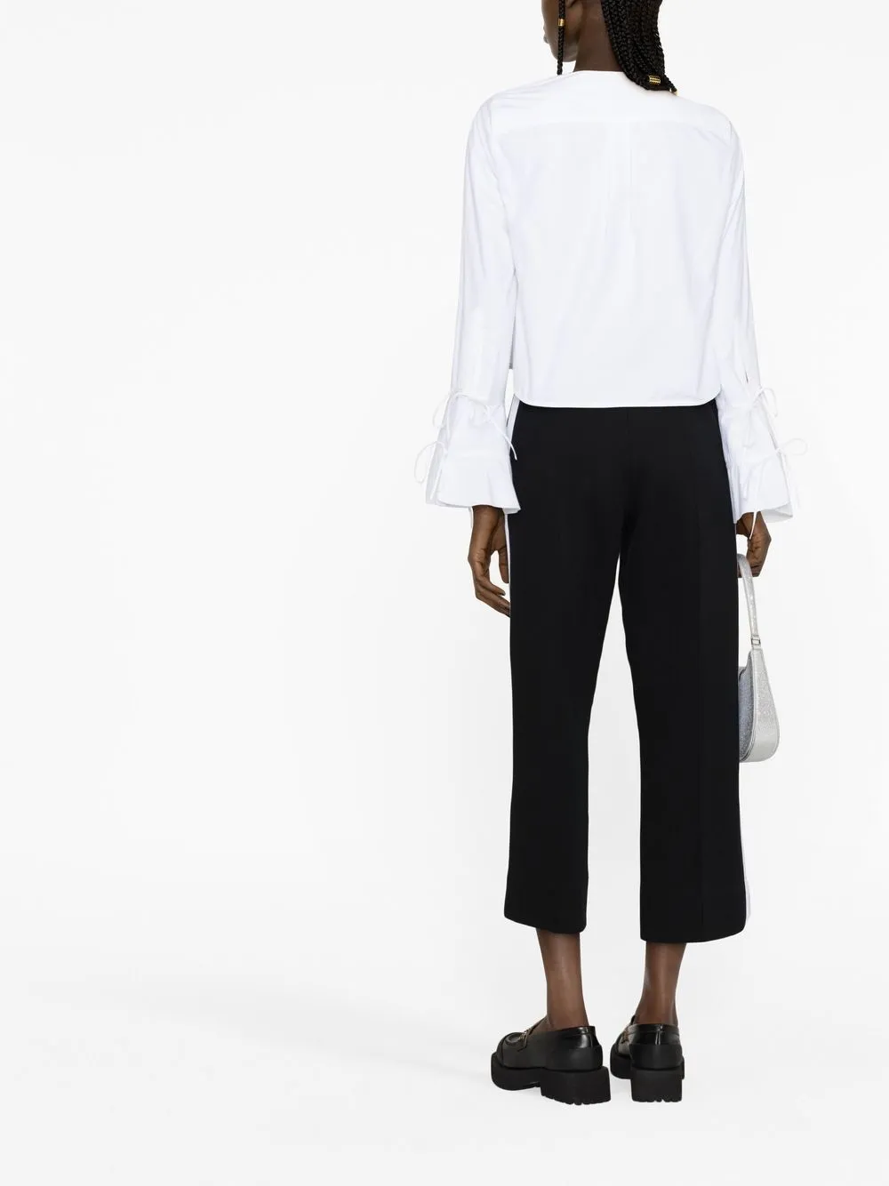 Белый, хлопок, V-образный вырез, застежка на пуговицах спереди, вышитый логотип спереди, расклешенные рукава, укороченная длина и неравномерный подол.