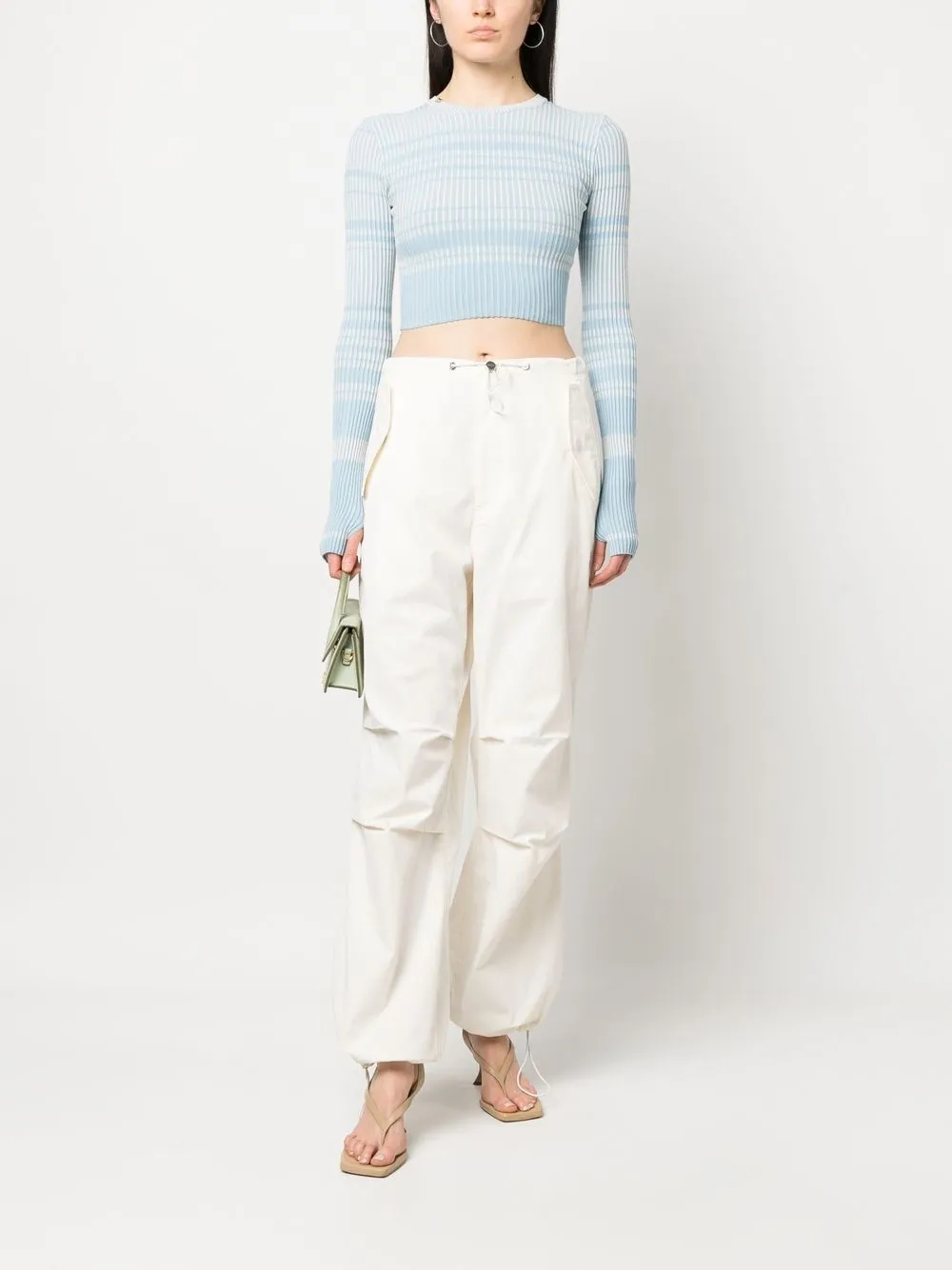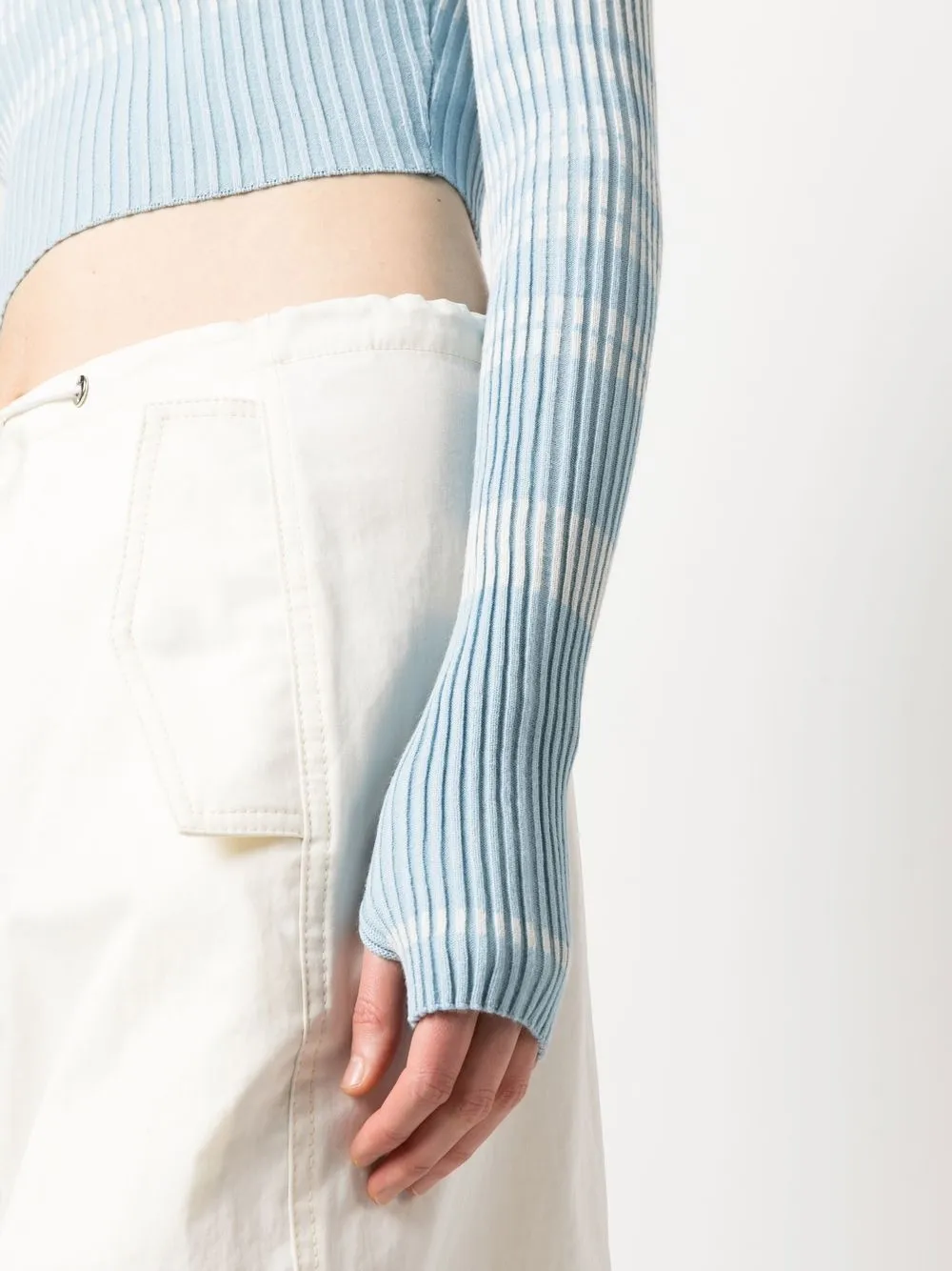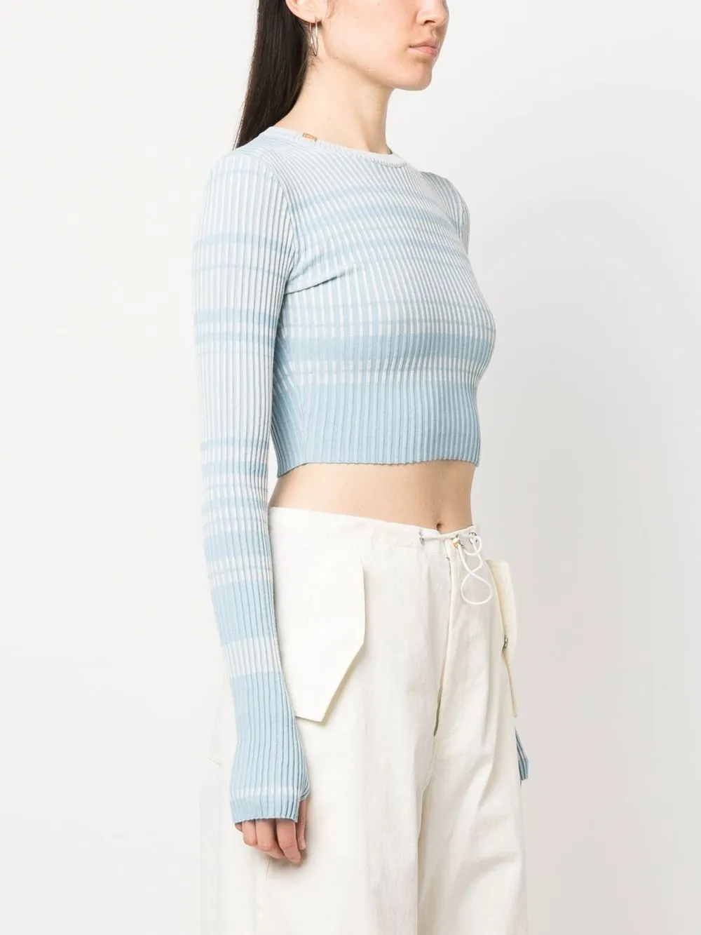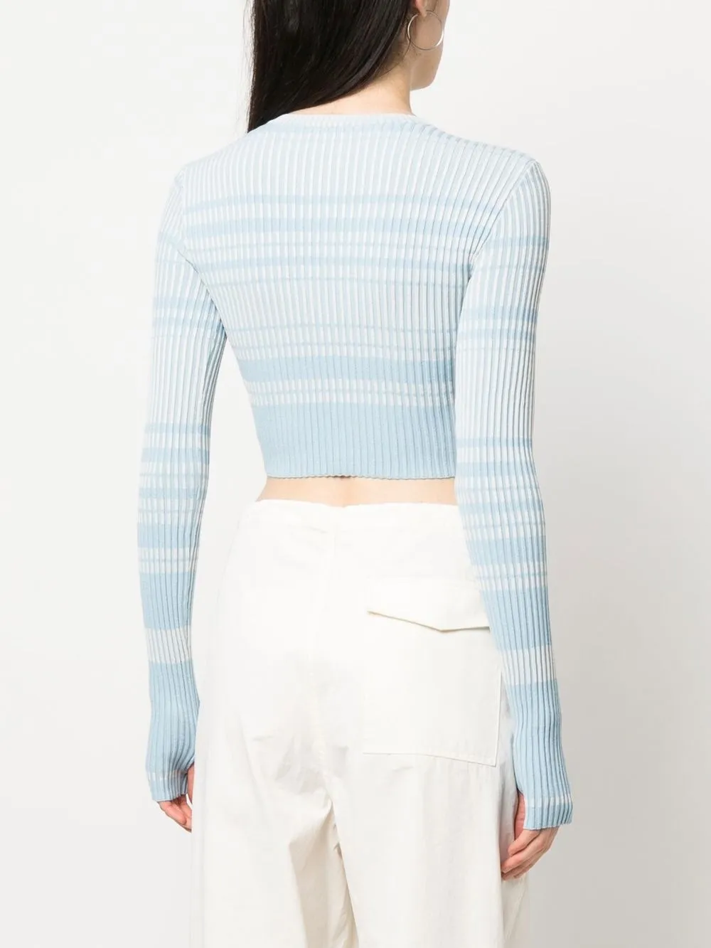 Голубой, пудрово-голубой, узор в горизонтальную полоску, трикотаж в рубчик, круглый вырез, длинные рукава, прямой подол и укороченная длина.