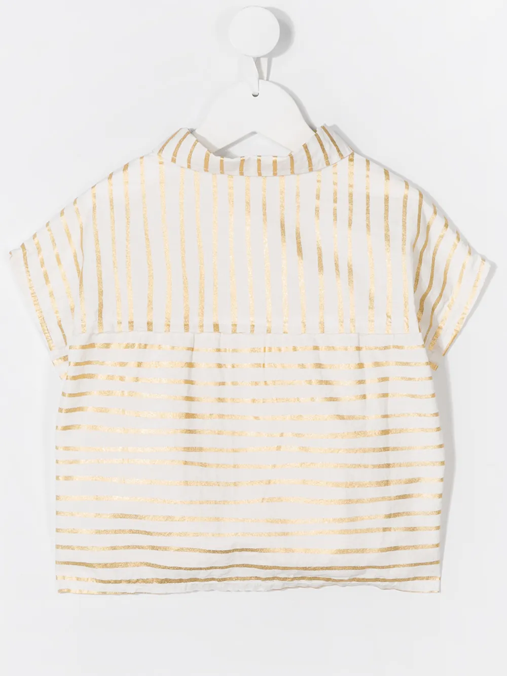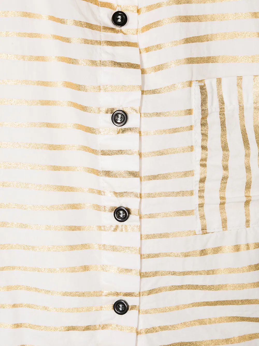Укороченная рубашка в полоску от Andorine. Заостренный воротник, застежка на пуговицах спереди, короткие рукава, нагрудный карман и прямой подол.