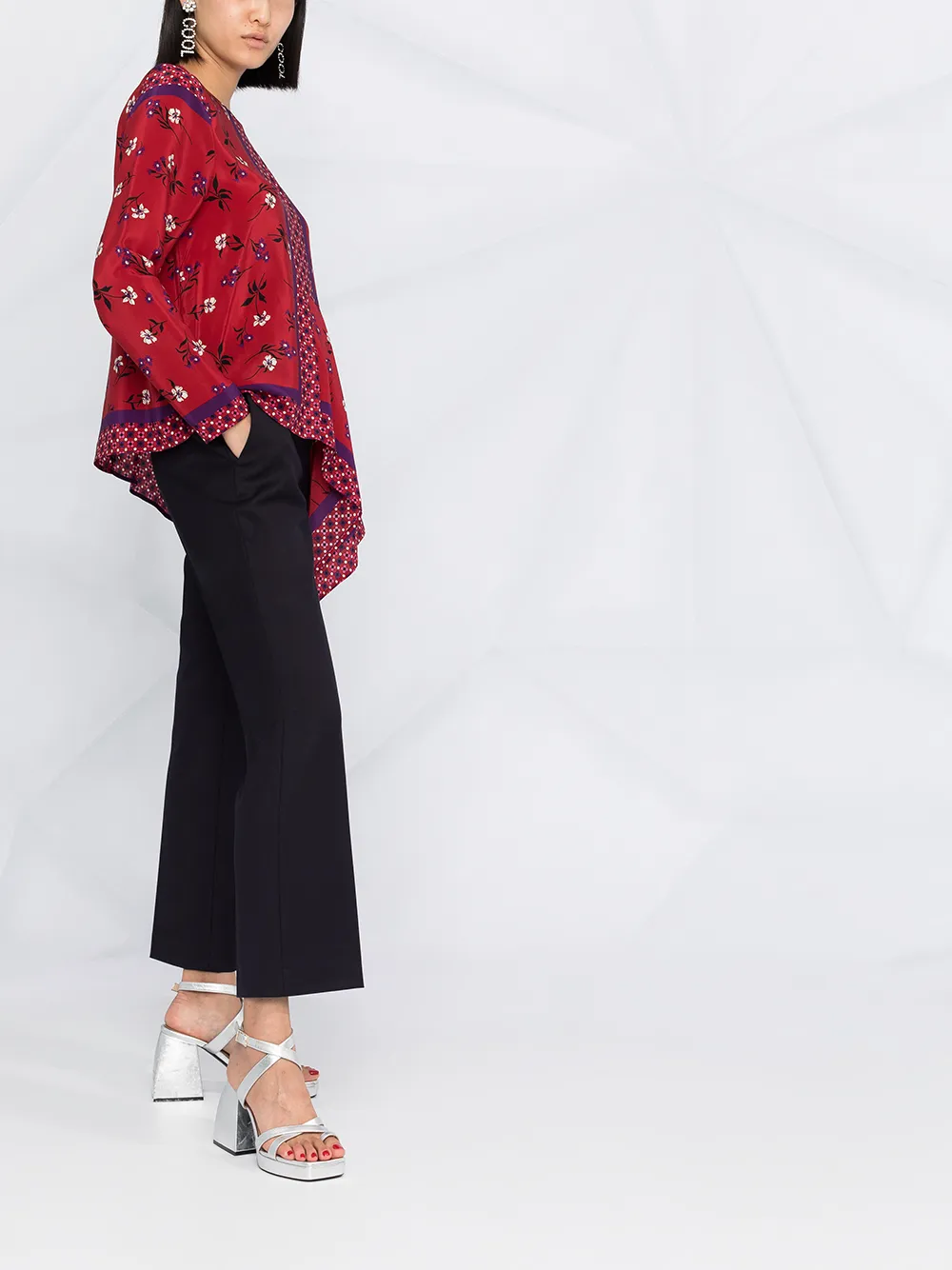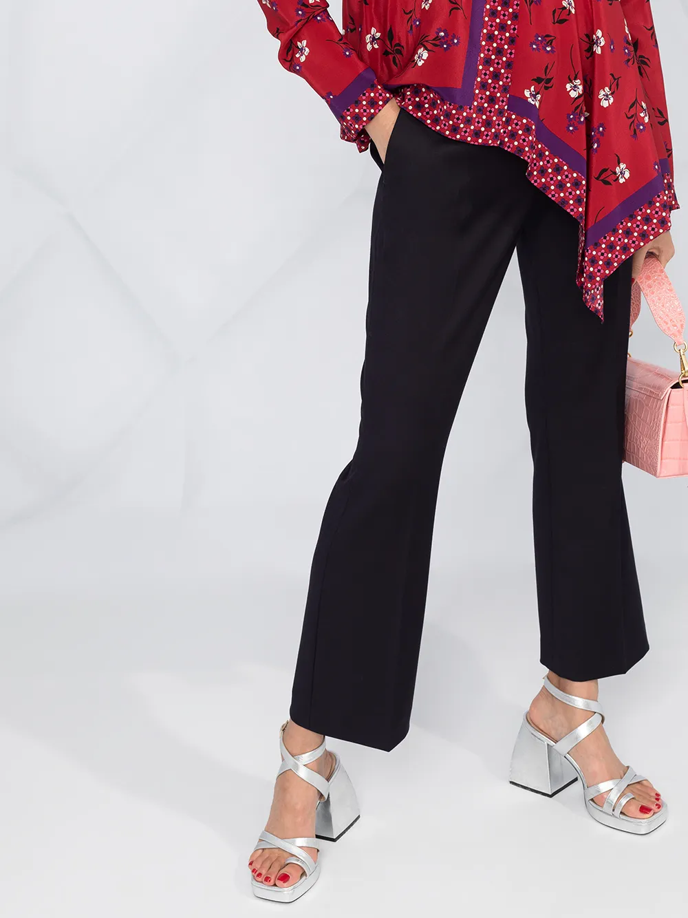 Средняя посадка, петли для ремня, потайная застежка спереди, расклешенный крой, укороченная длина и два прорезных кармана по бокам.