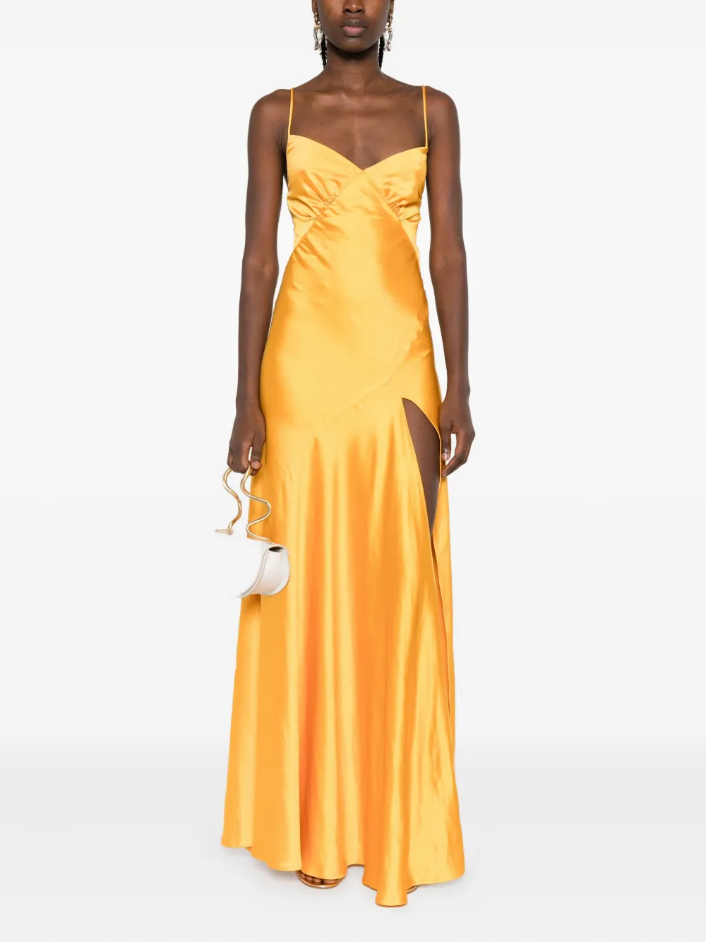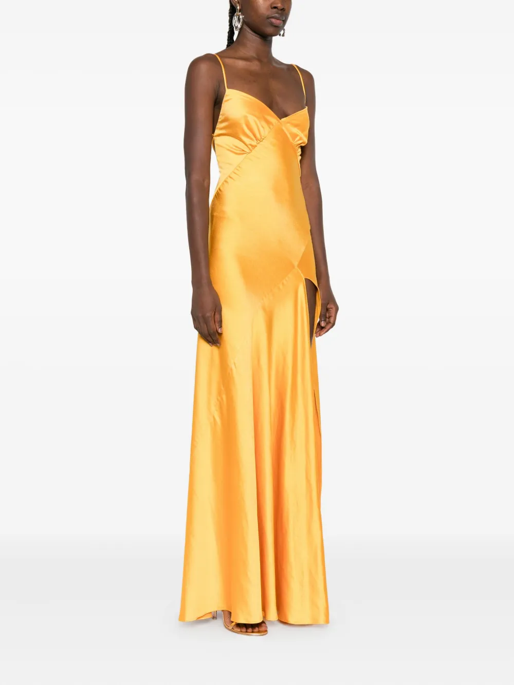 Желтые бретели крест-накрест на спине, разрезы по бокам, длина макси