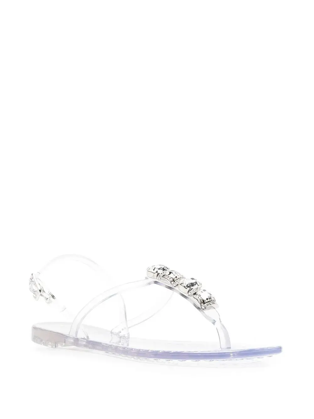 Белый, декор из кристаллов, Т-образный ремешок, ремешок на пятке, боковые застежки с пряжками, стелька с логотипом и плоская резиновая подошва.