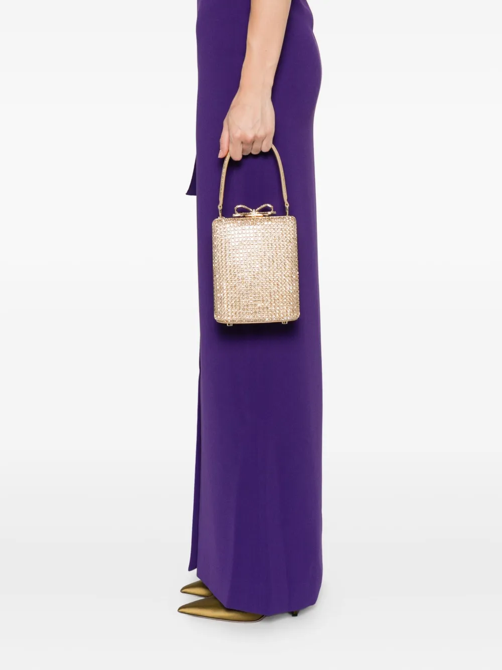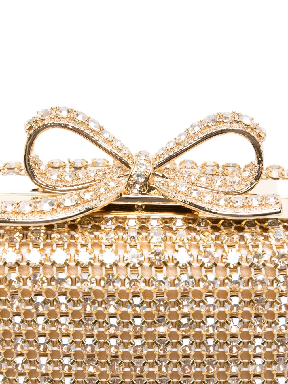 Украшение из золотистых кристаллов в форме коробки с верхней ручкой, цепочным ремешком и бантом