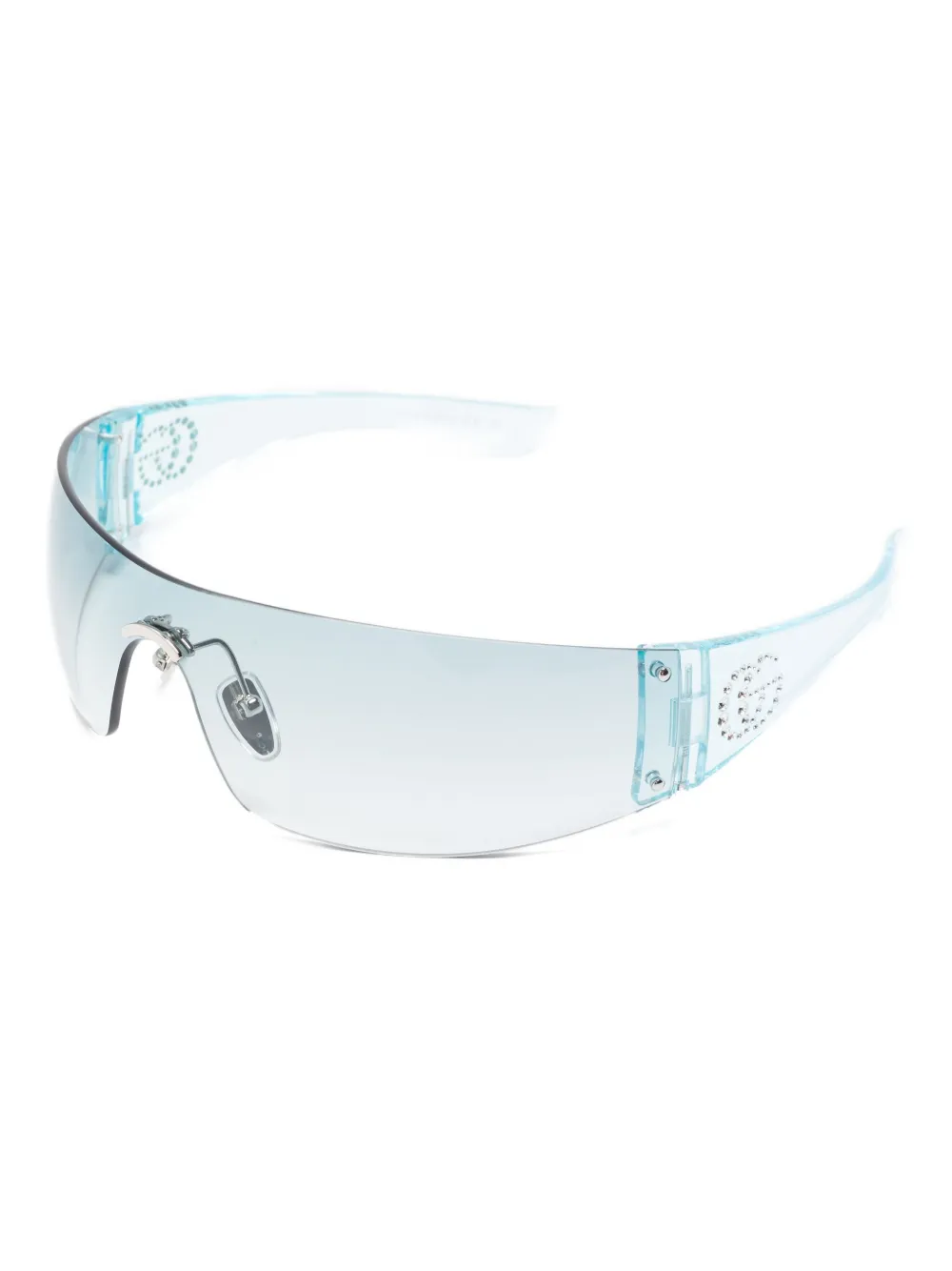 Светло-голубая оправа со стразами, градиентные линзы, детали из серебристого металла. Очки поставляются с защитным футляром.
