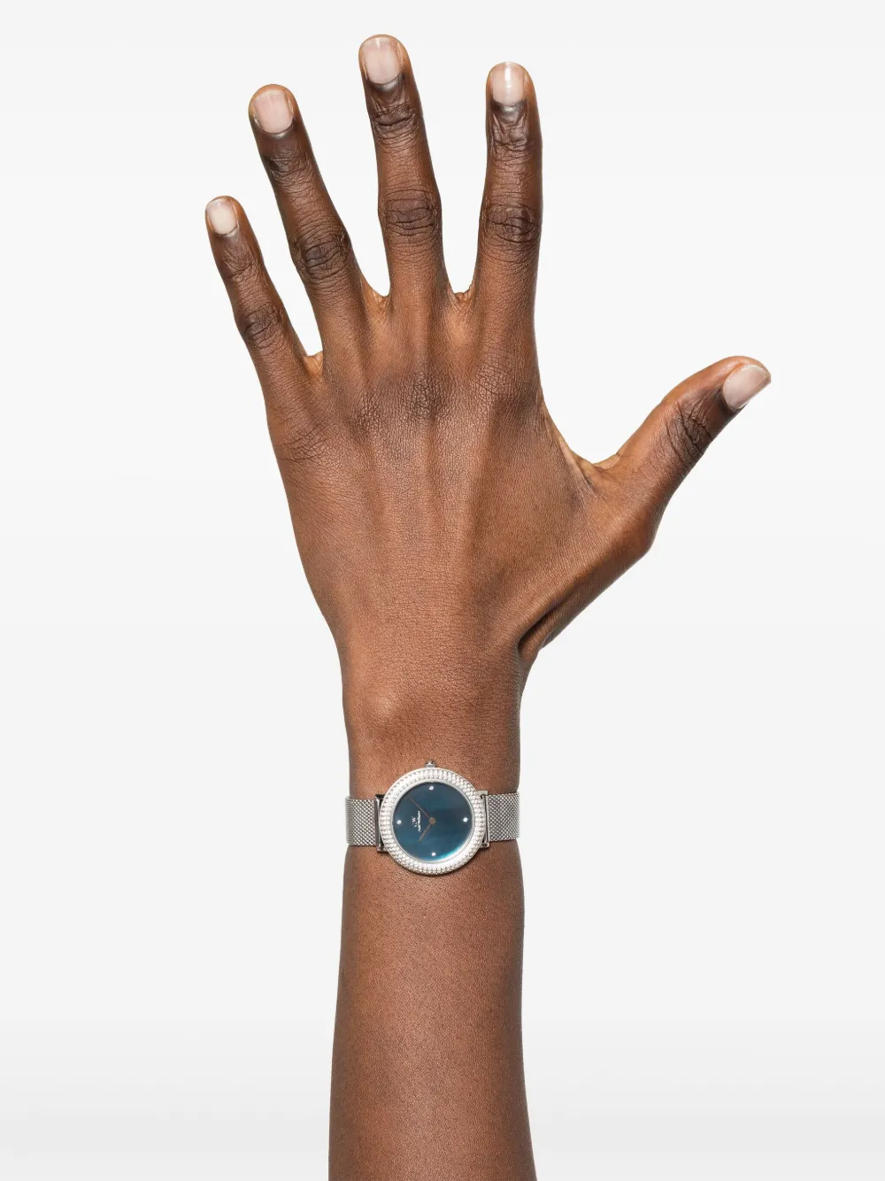 32-миллиметровый кварцевый механизм из нержавеющей стали, круглый циферблат, перламутровый циферблат цвета морской волны, принт с логотипом, циферблат из кристаллов, стрелки в форме мечей, инкрустированный кристаллами безель, завинчивающаяся заводная головка, гравированная задняя крышка, серебристый браслет из нержавеющей стали, раскладывающаяся застежка с кнопкой, водонепроницаемость до 30 м/3 АТМ.