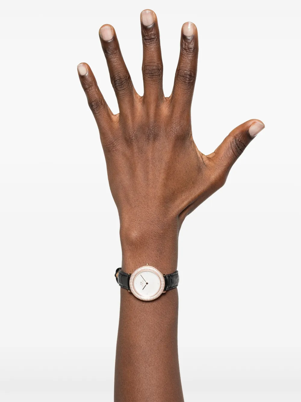 32-миллиметровый кварцевый механизм из нержавеющей стали, круглый циферблат, белый перламутровый циферблат, логотип с принтом, циферблат из кристаллов, стрелки в форме мечей, безель, инкрустированный кристаллами, завинчивающаяся заводная головка, гравированная задняя крышка, черный ремешок из кожи с тиснением под крокодила, застежка-пряжка, перфорированные отверстия, водонепроницаемость до 30 м/3 АТМ.