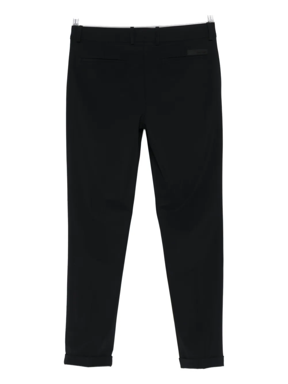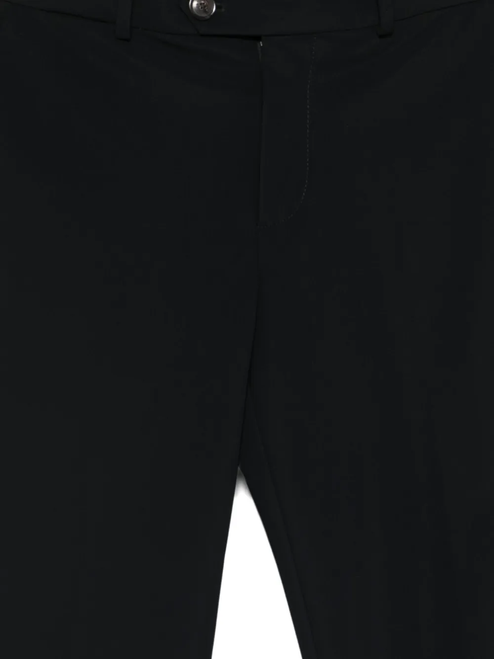 Черная застежка на пуговицы спереди, манжеты, шлевки для ремня, прорезные карманы сзади, два диагональных кармана.