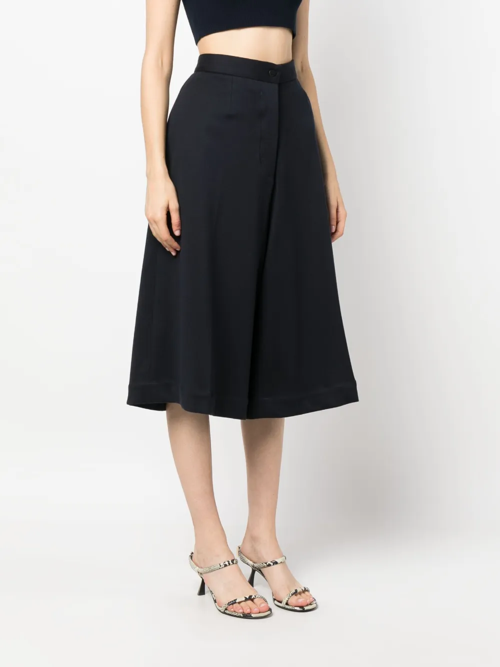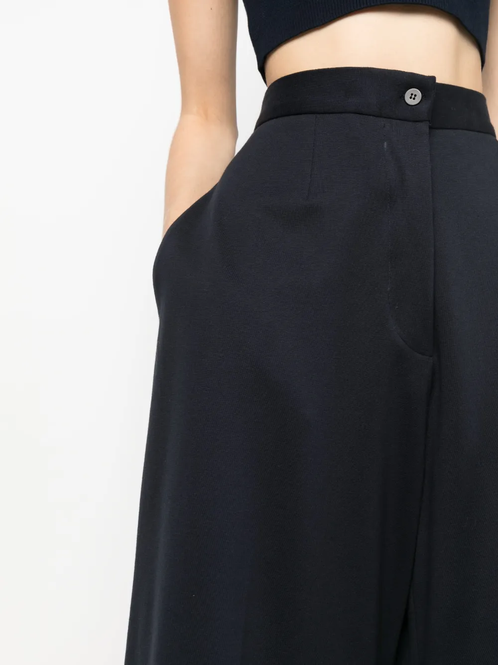 Темно-синий, хлопок, широкий крой, завышенная талия, защипы, застежка на пуговицах спереди, стрелки и длина ниже колена.