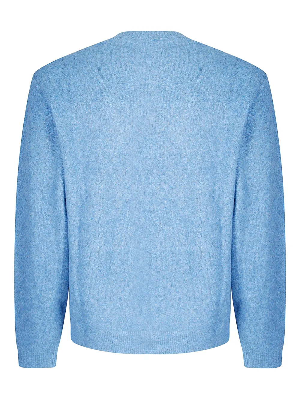 Синяя шерстяная смесь, круглый вырез горловины, длинные рукава, маленькая нашивка с логотипом