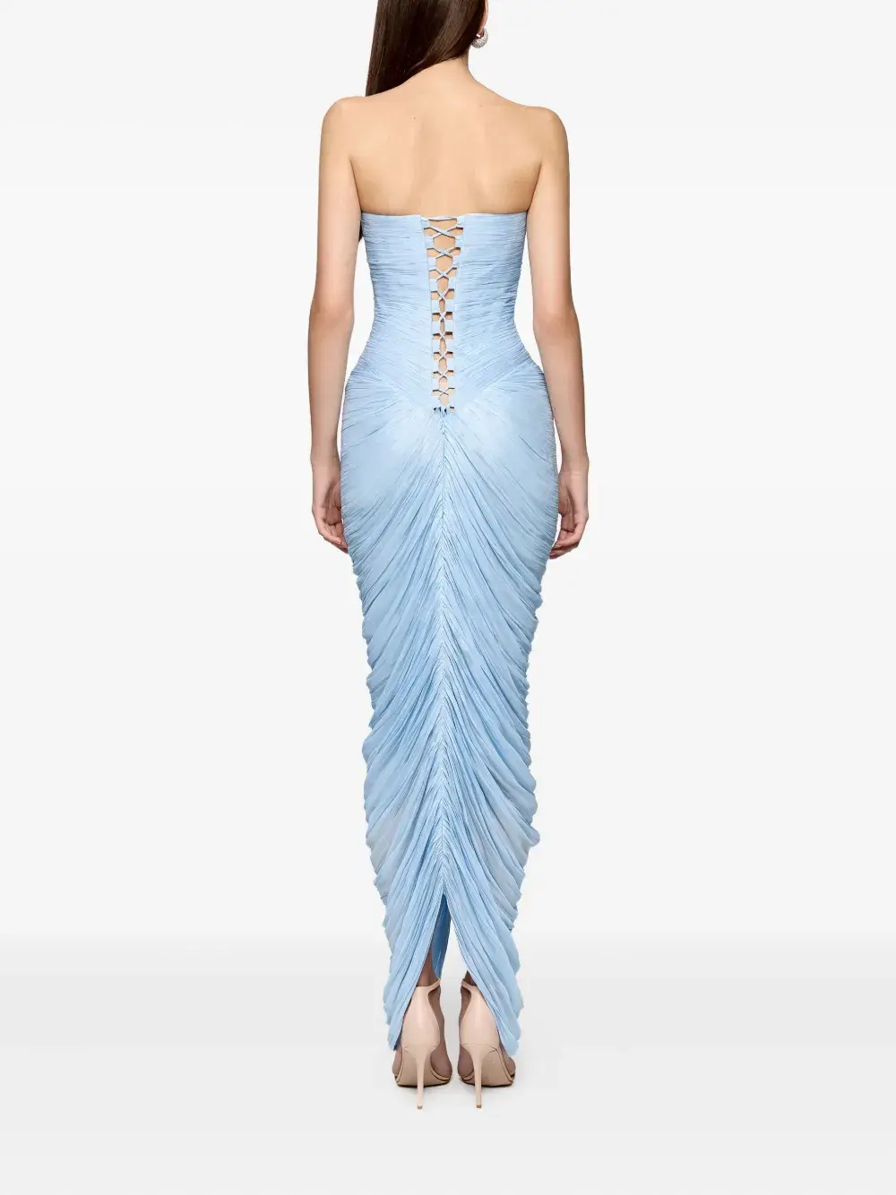 Светло-голубой вырез без бретелек, драпированная ткань, вырезы, потайная застежка-молния, шнуровка сзади.