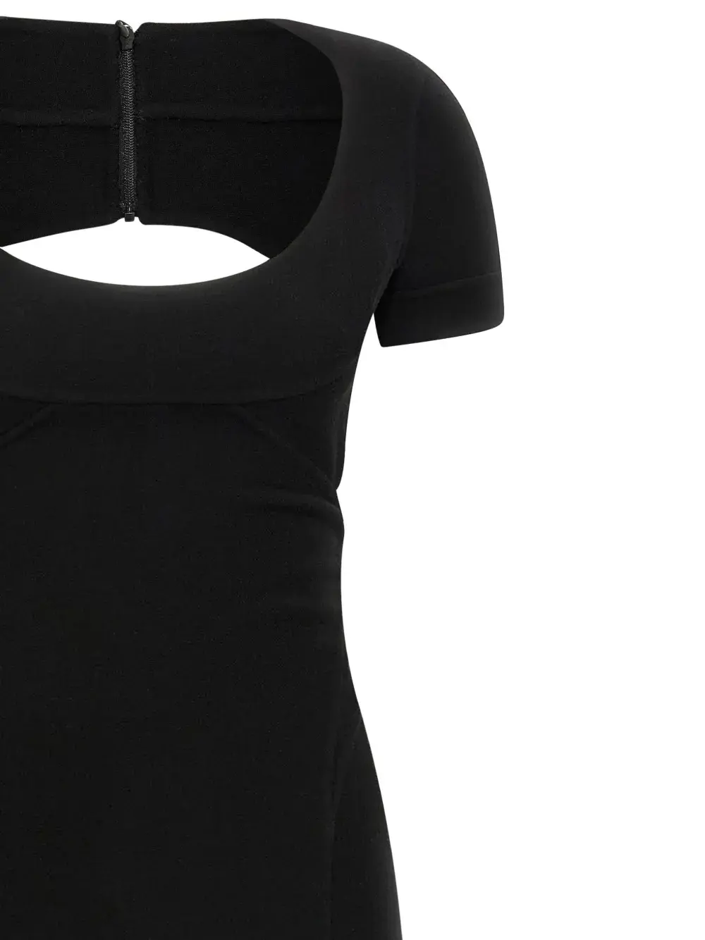 Черный, с короткими рукавами, облегающим силуэтом, вырезом на спине, застежкой-молнией.