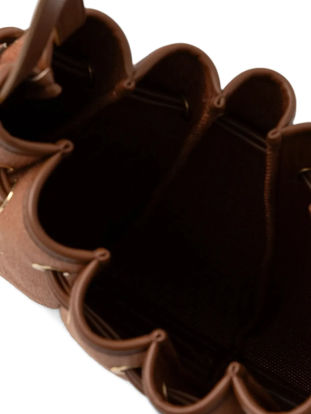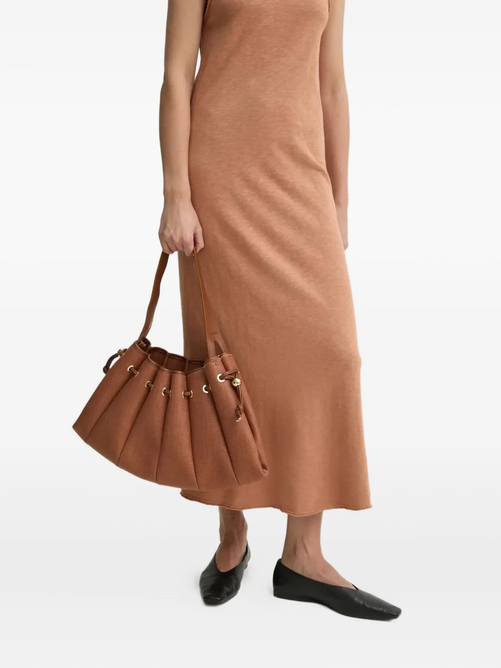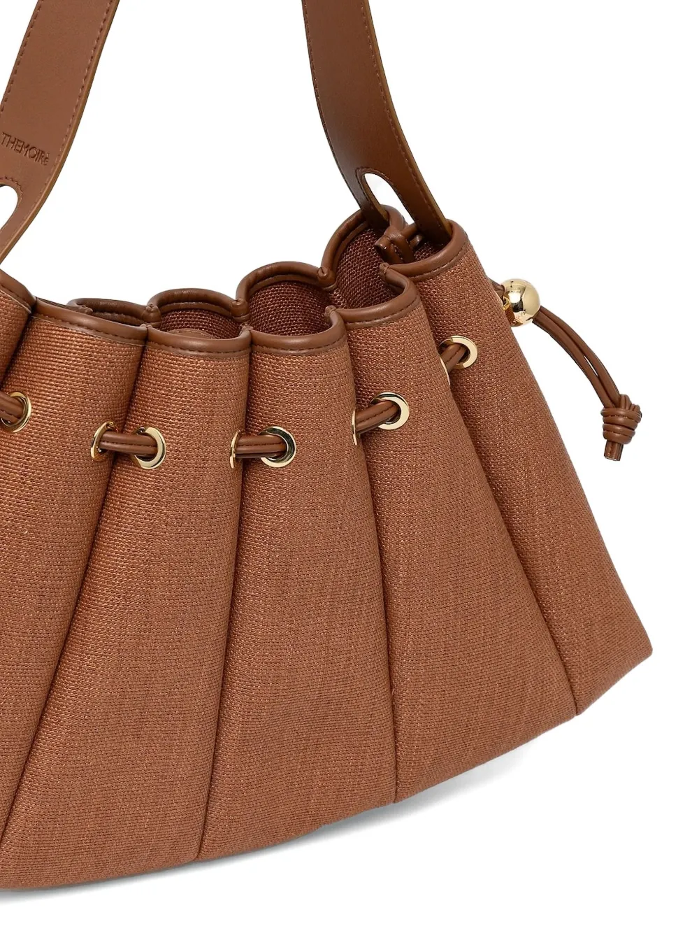 Коричневый плиссированный дизайн, одна ручка сверху, застежка на шнурок, фурнитура золотистого цвета