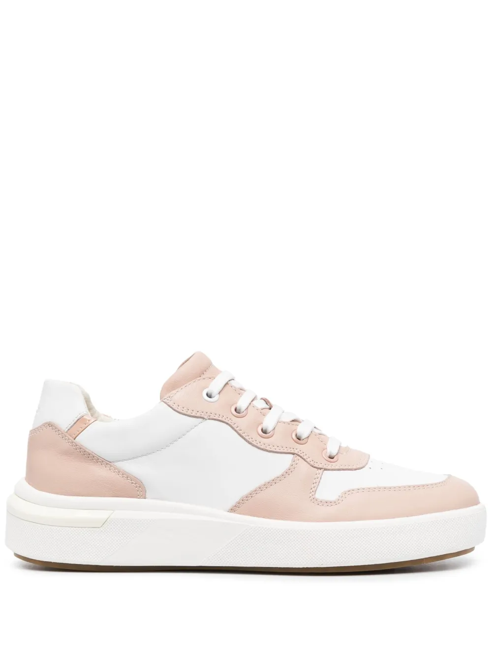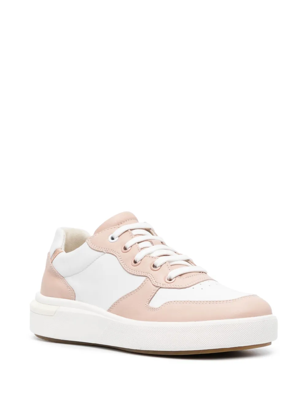 Белый, светло-розовый, телячья кожа, вставки, перфорация, тисненый логотип сзади, стелька с логотипом, закругленный носок, шнуровка спереди и плоская резиновая подошва.