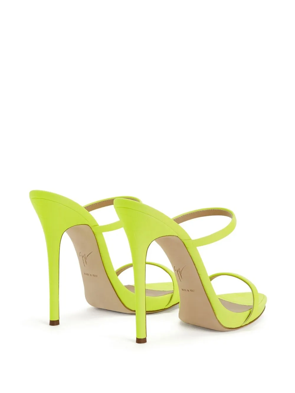 Ярко-зеленый, кожа, стелька с логотипом, браслет в два оборота, открытый носок и каблук на высокой шпильке.