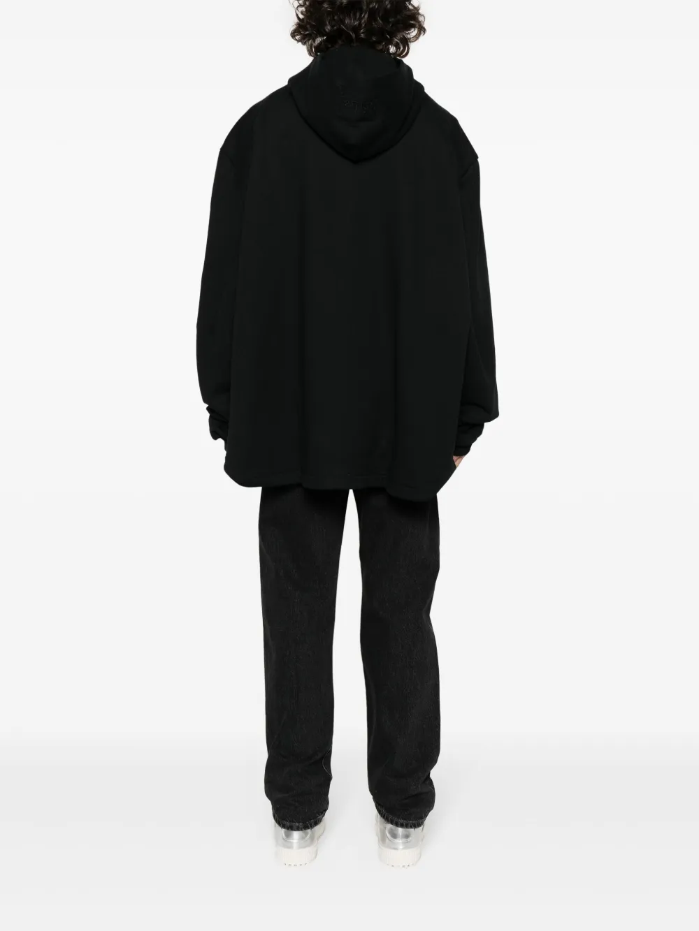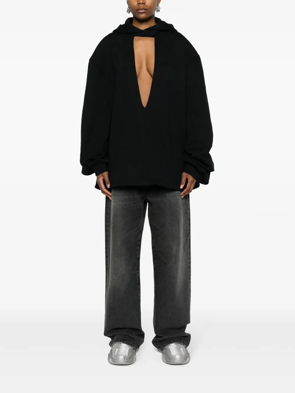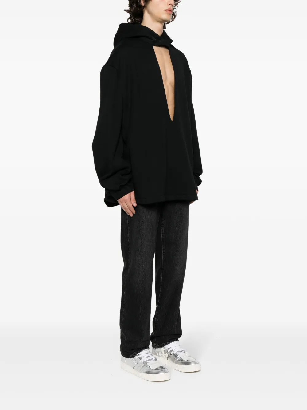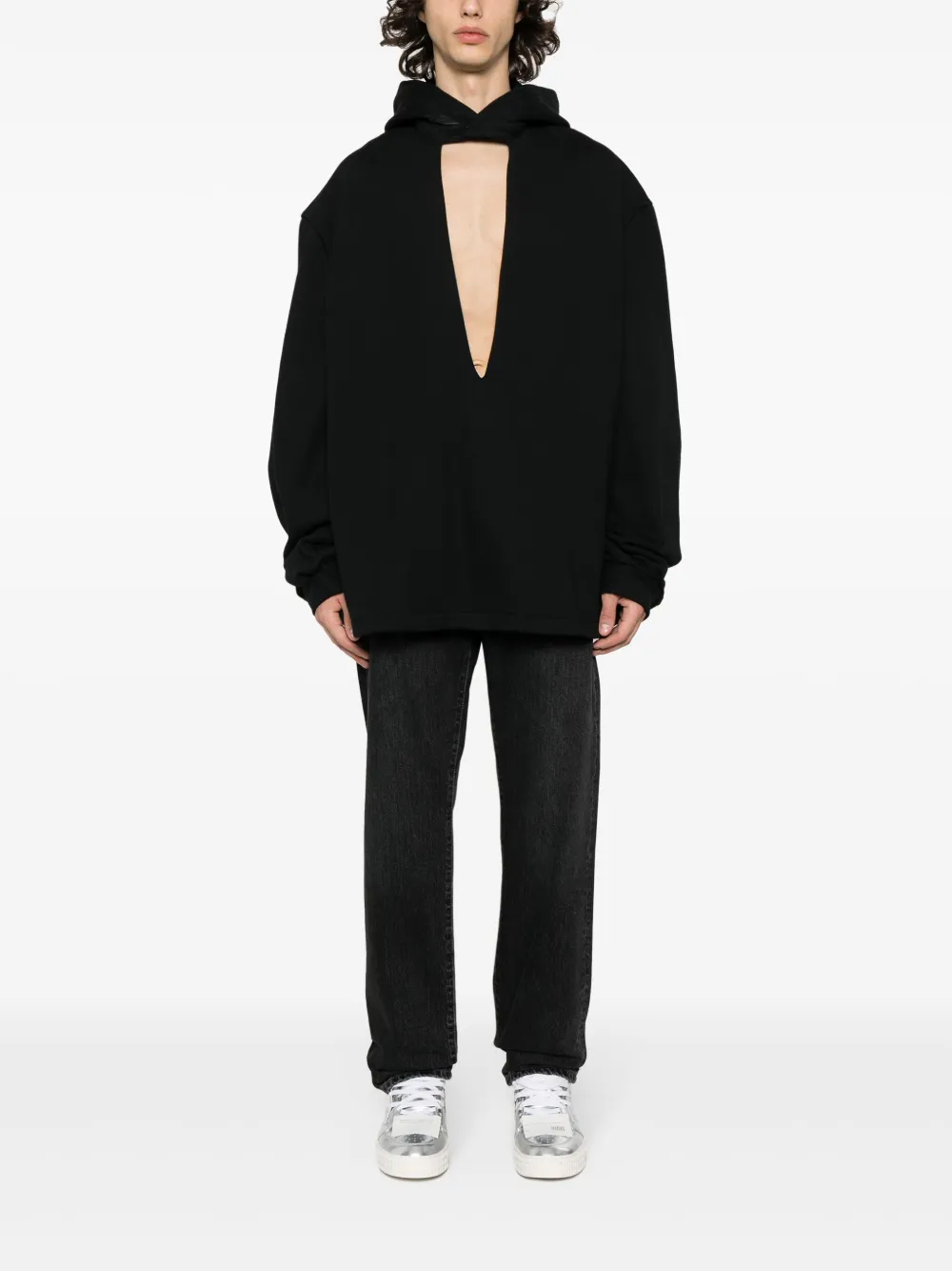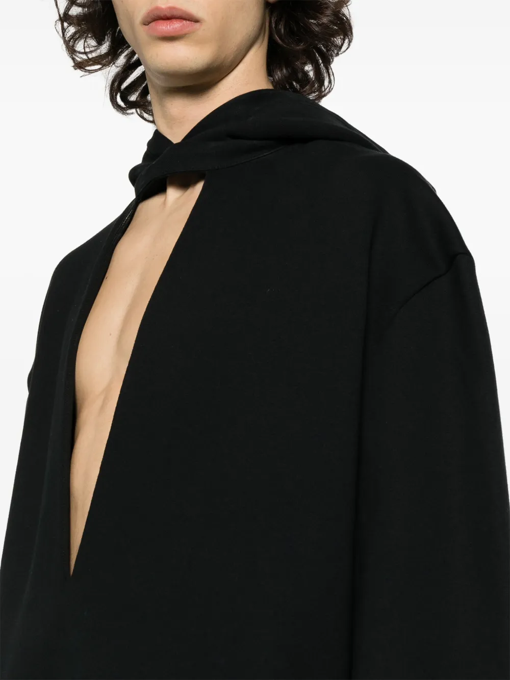 Черный, хлопок, вырезные детали, глубокий V-образный вырез, классический капюшон, удлиненные рукава и прямой подол.
