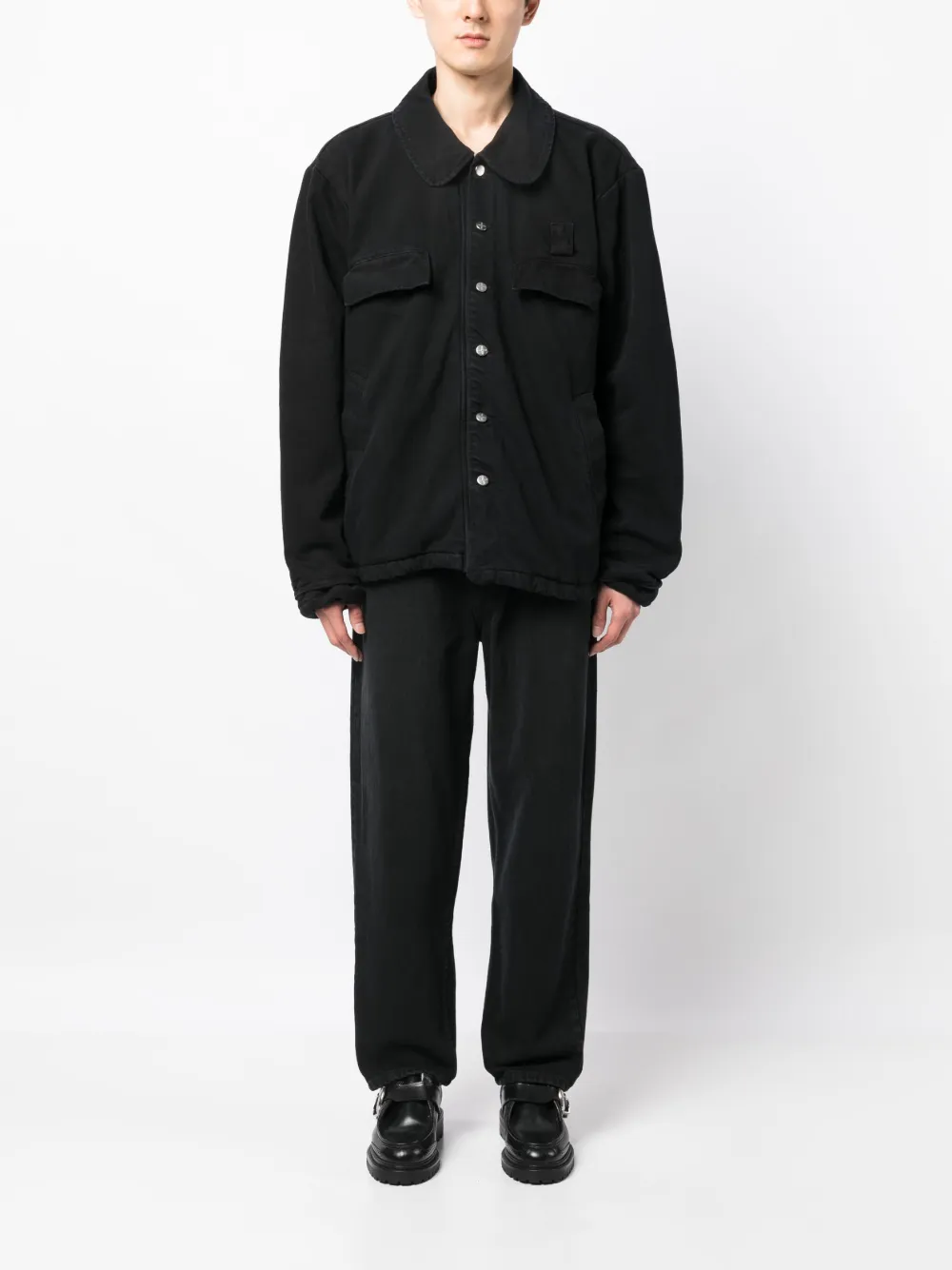 Черный, хлопок, окрашивание готовой вещи по технологии garment dye, деним, закругленный воротник, застежка на пуговицах спереди, длинные рукава, манжеты в рубчик, нагрудные карманы с клапаном, два прорезных кармана по бокам и цельная подкладка.
