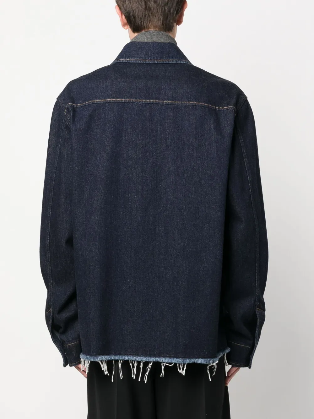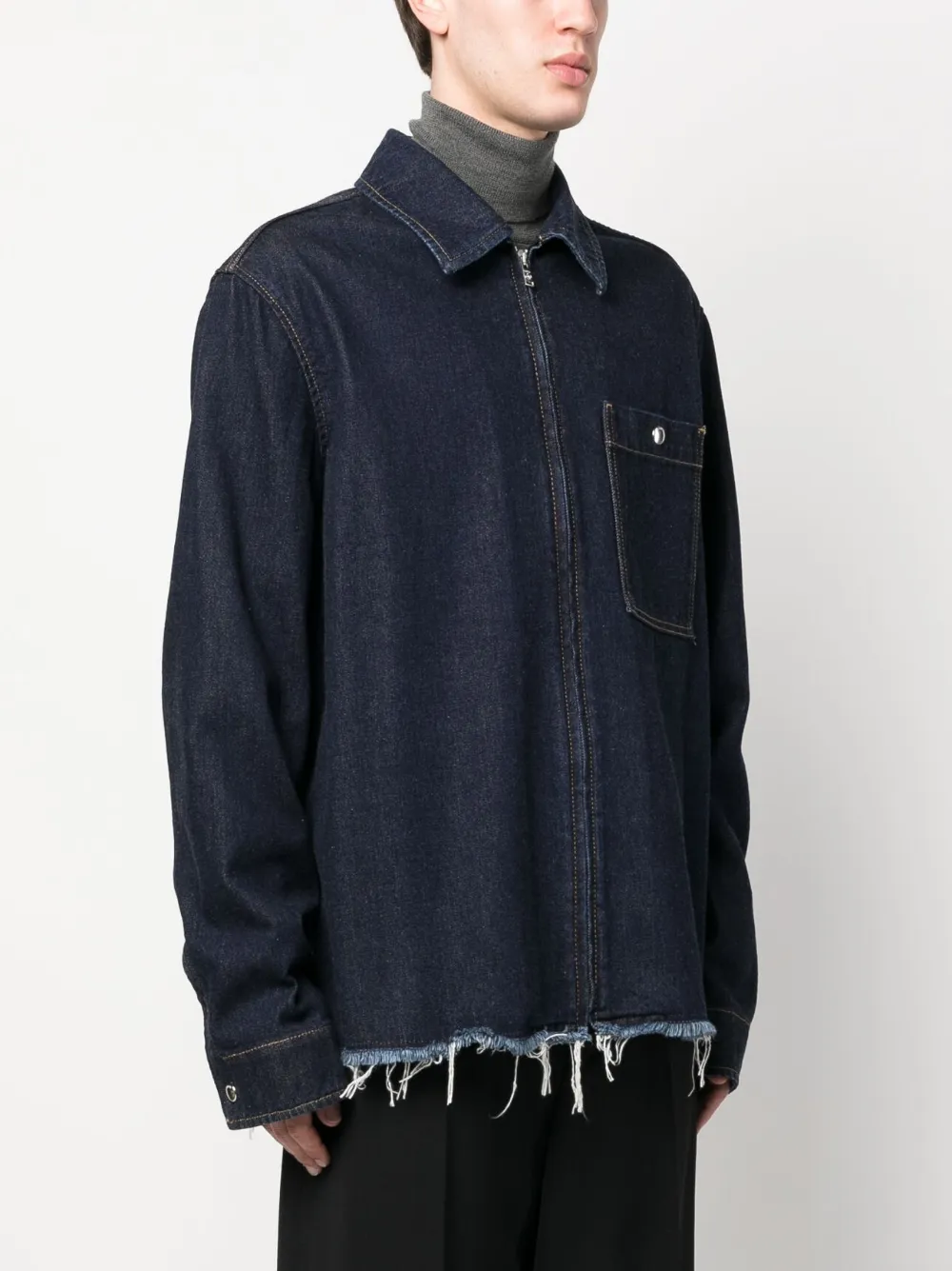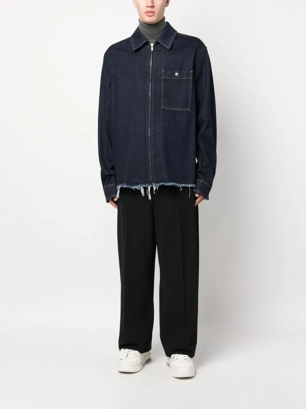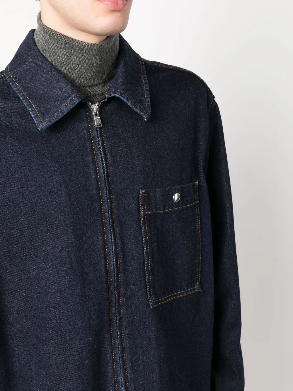 Темно-синий, хлопок, деним, классический воротник, застежка на молнии спереди, нагрудный накладной карман, длинные рукава, манжеты с застежкой на кнопки и необработанный подол.