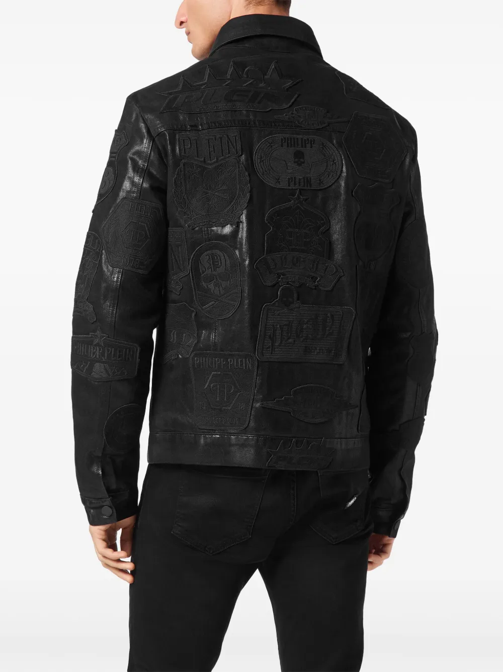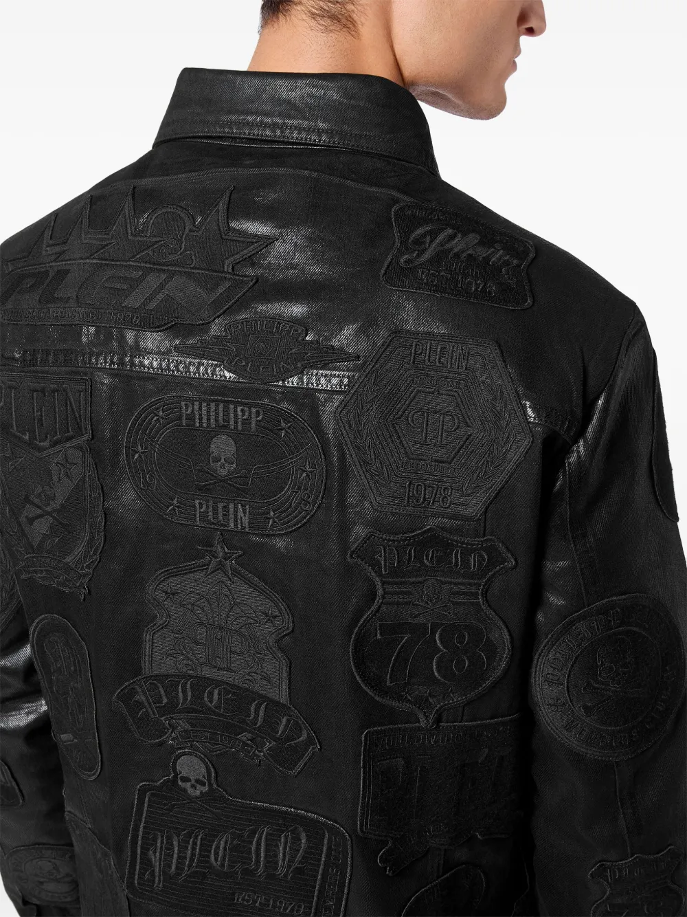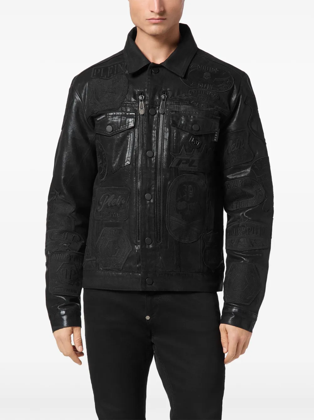 Подробнее о товаре: • черный • хлопок • деним • однотонная расцветка • застежка на пуговицах спереди • классический воротник • нашивки с логотипом спереди • отделка с декоративной молнией • два нагрудных кармана с клапанами • вышивка с изображением черепа спереди • вышивка с изображением черепа на тыльной стороне • длинные рукава • манжеты на пуговицах • два прорезных кармана сбоку • прямой подол
