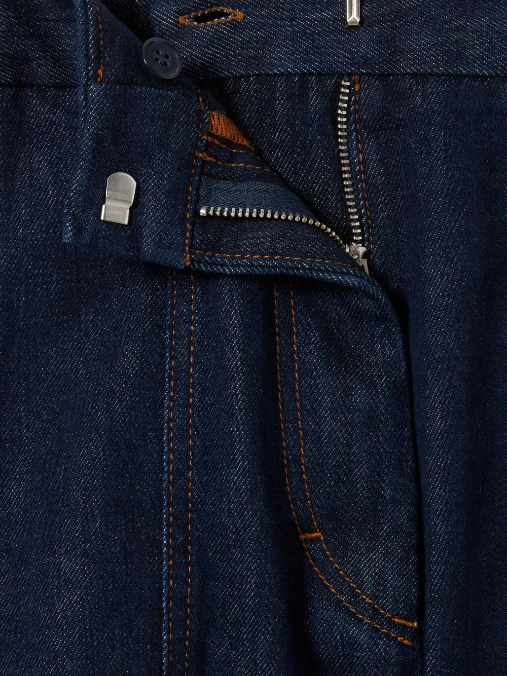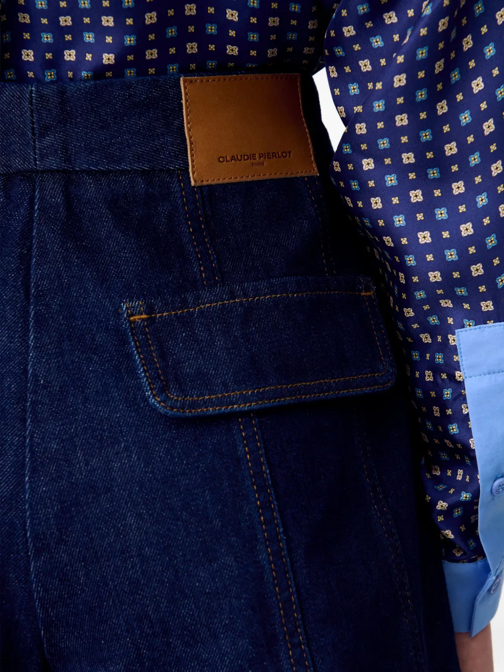 Темно-синий хлопковый материал, потайная застежка спереди, панельный дизайн, карманы с клапанами сзади