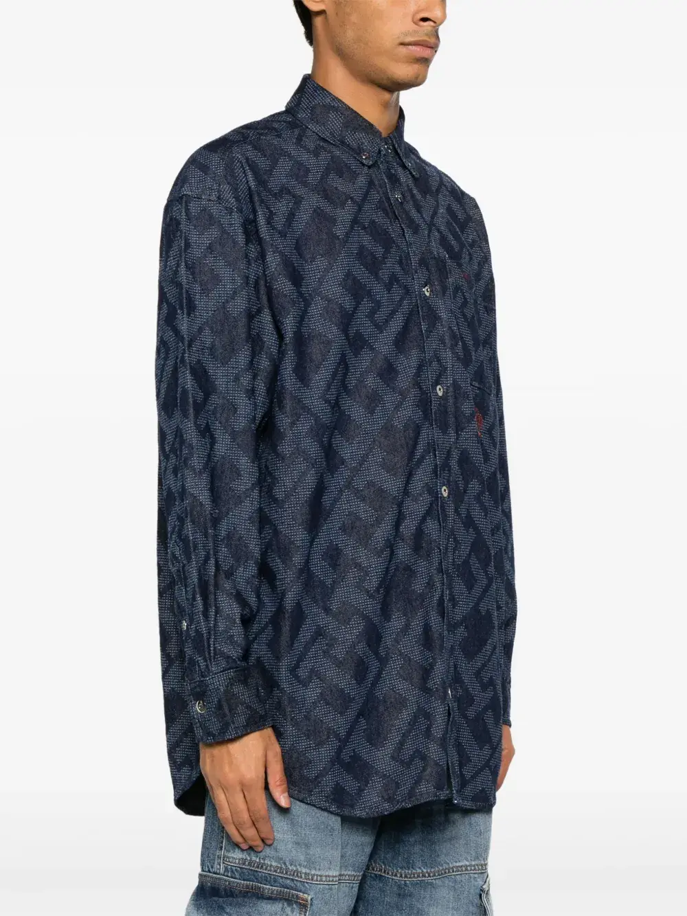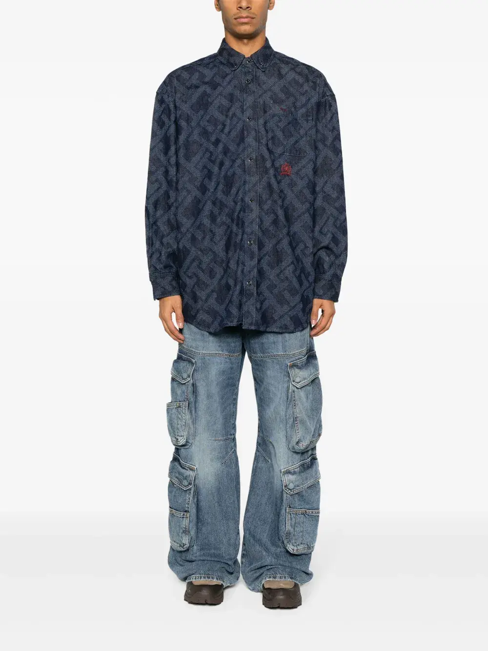 Индиго, смесовый хлопок, переработанный хлопок, деним, жаккард с монограммой, узор с эмблемой, вышитый логотип спереди, воротник на пуговицах, застежка на пуговицах спереди, приспущенные плечи, длинные рукава, манжеты на пуговицах, нагрудный накладной карман и закругленный подол. Это унисекс-модель. Обратите внимание, что для нее используется мужская размерная сетка.