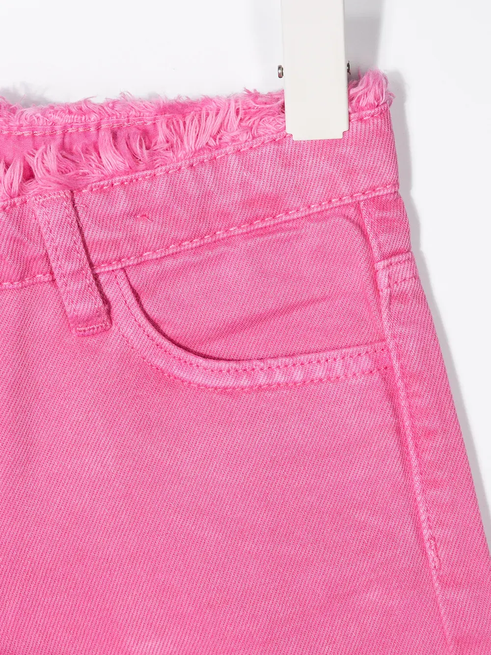 Джинсовые шорты с бахромой от Monnalisa. Пояс с петлями для ремня, ширинка на молнии с пуговицей, короткая длина и необработанные края. Цвет: розовый.