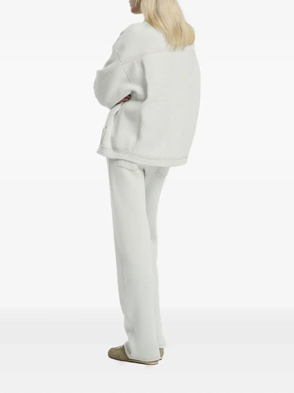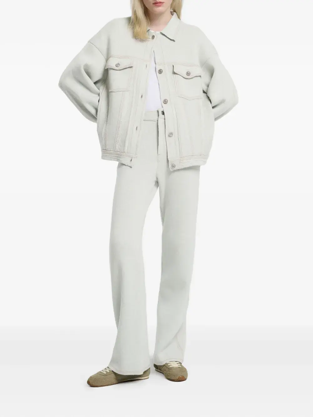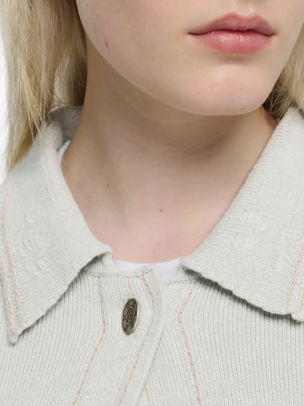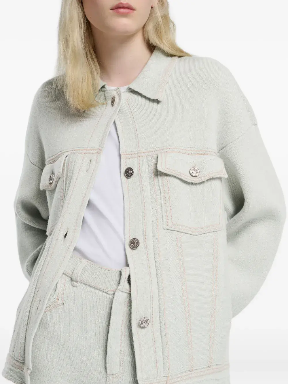 Застежка на светло-зеленые пуговицы, контрастная отделка, карманы с клапанами, трикотажная текстура.