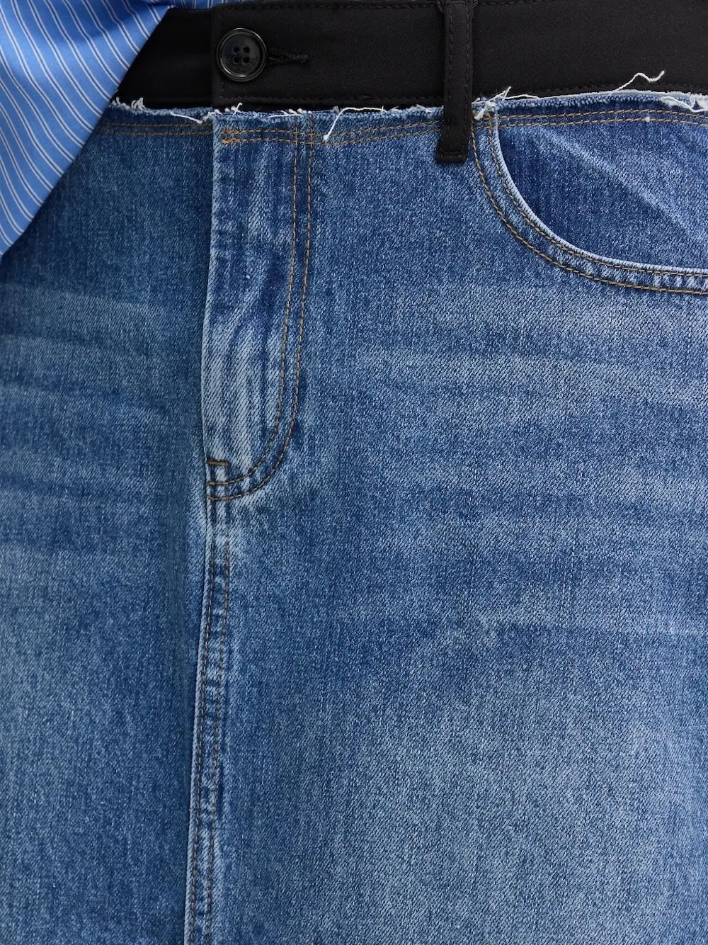 Синяя джинсовая ткань, черная вставка по центру спереди, разрез, застежка на пуговицы