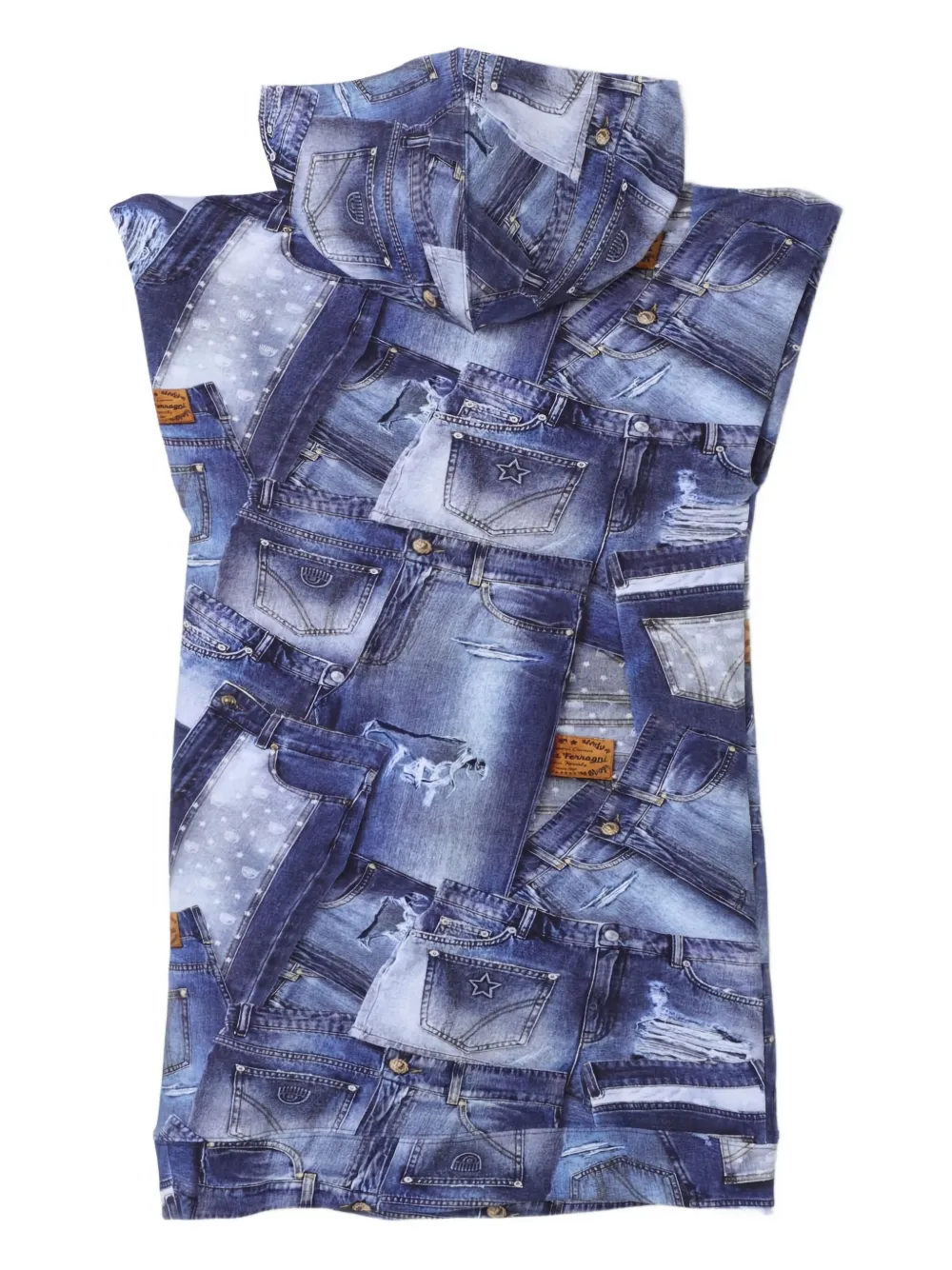 Синяя джинсовая модель с принтом, капюшоном, без рукавов