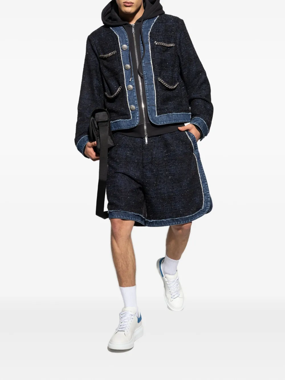 Темно-синий твид с джинсовой отделкой, потертыми краями, застежкой на молнию и пуговицы.