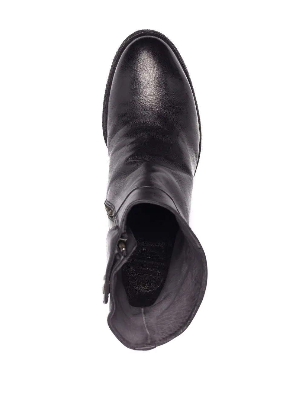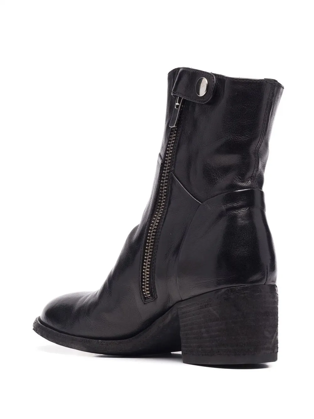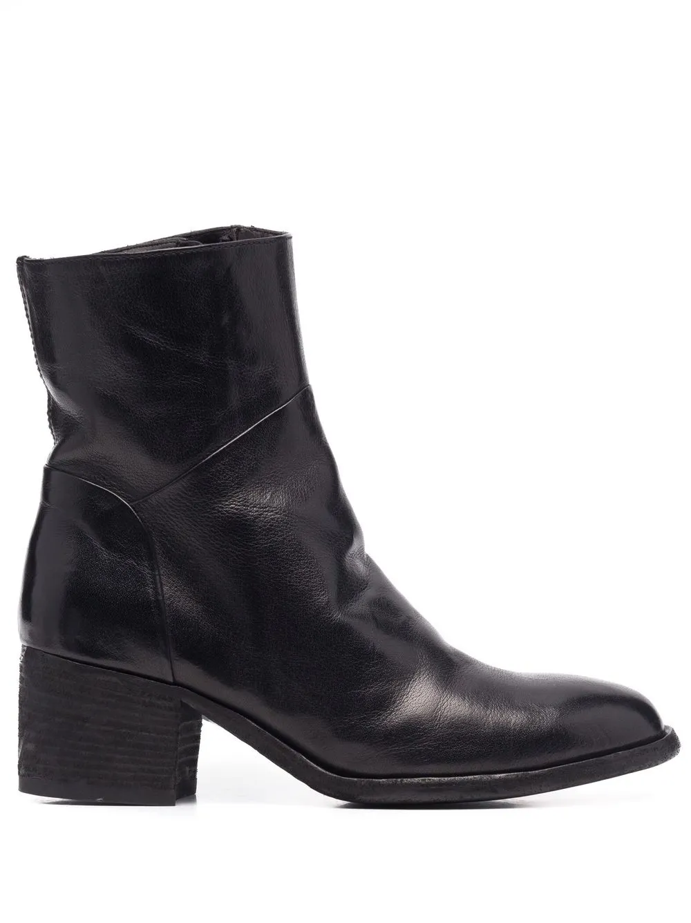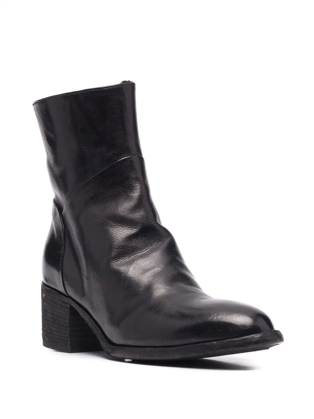 Черный, кожа, длина по щиколотку, застежка на молнии сбоку, закругленный носок и наборный каблук средней высоты.