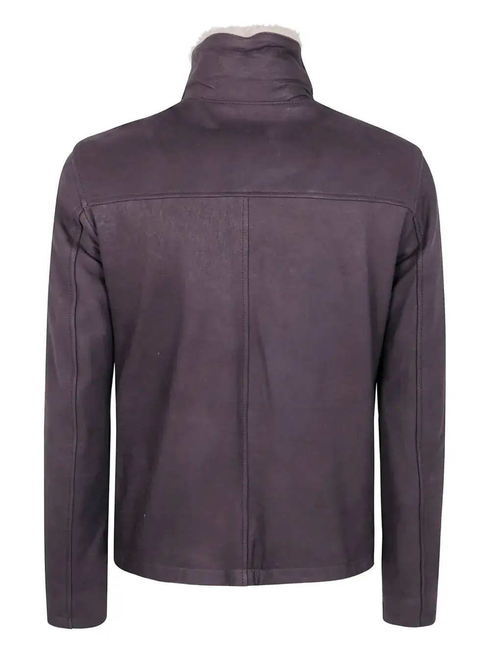 Темно-коричневая застежка-молния спереди, высокий воротник, подкладка из овчины, боковые карманы, длинные рукава, прямой подол.