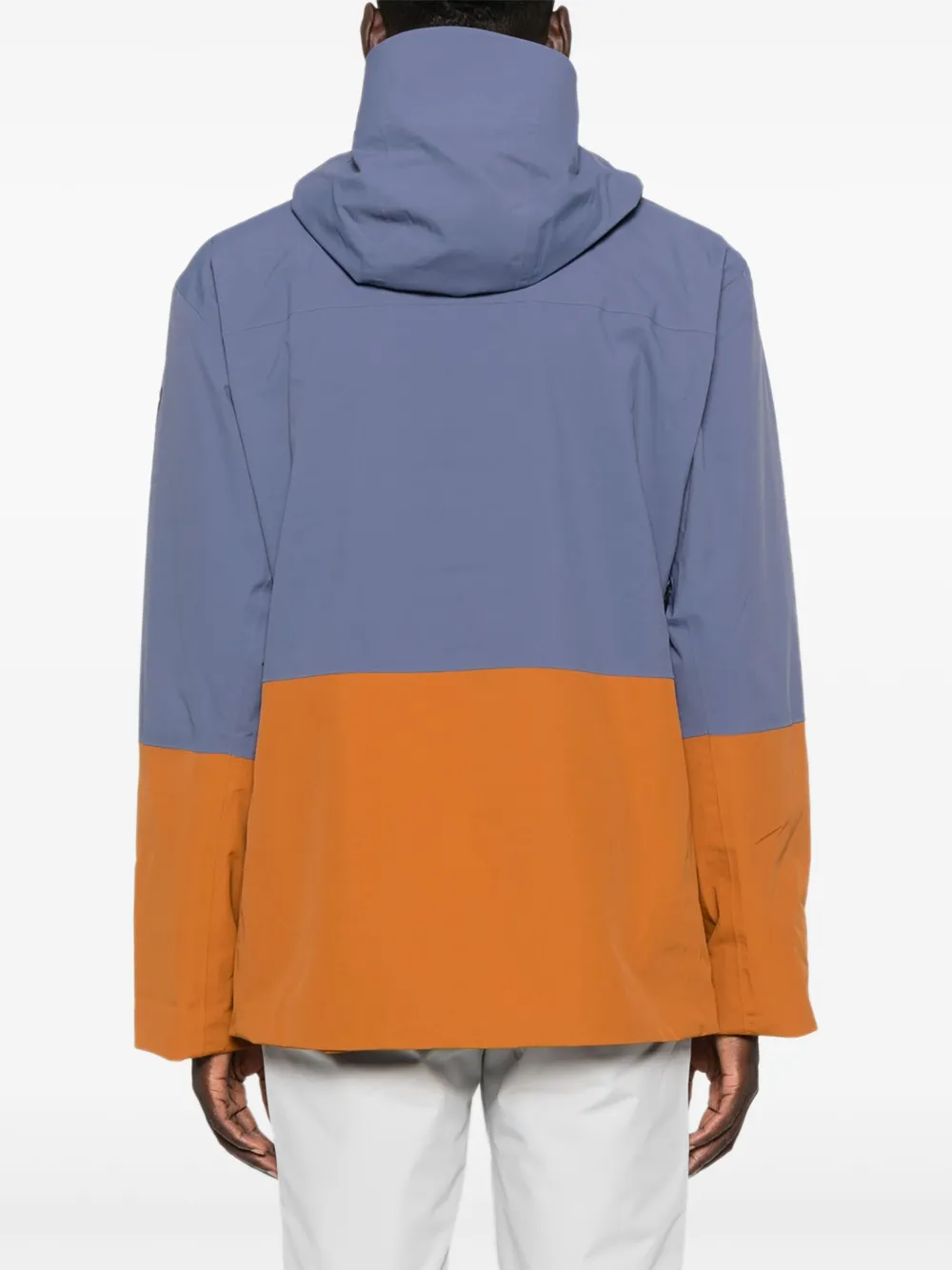 Темно-синий, с оранжевыми вставками, с капюшоном, застежкой-молнией, длинными рукавами и регулируемыми манжетами.