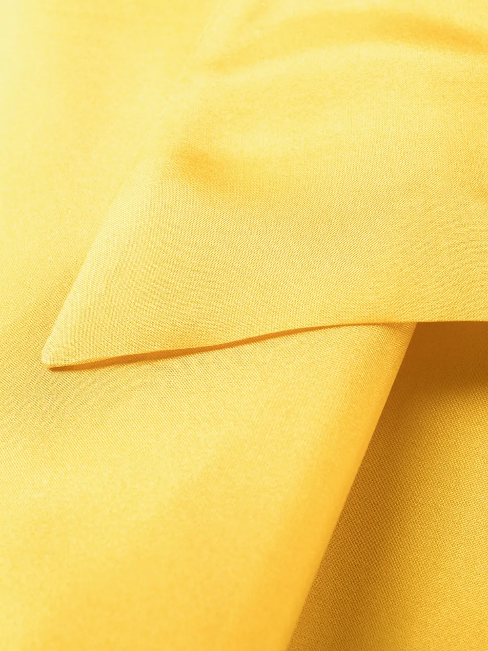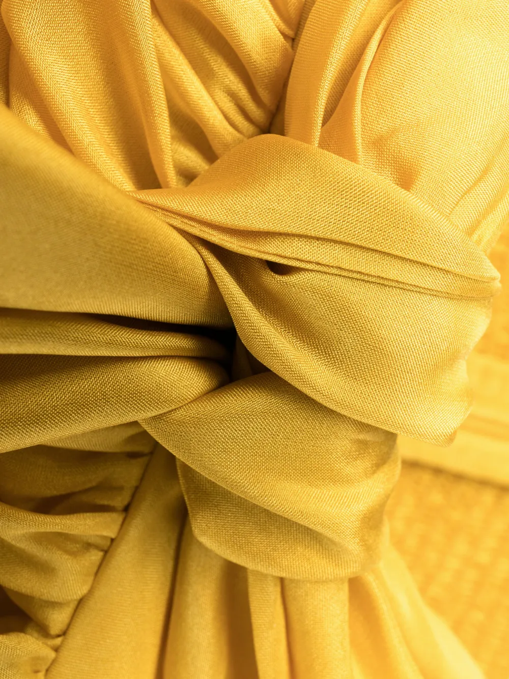 Горчично-желтый, шелк, завязки вокруг шеи, вырез в форме сердца, без рукавов, плиссированная юбка, асимметричный подол и два прорезных кармана сбоку.