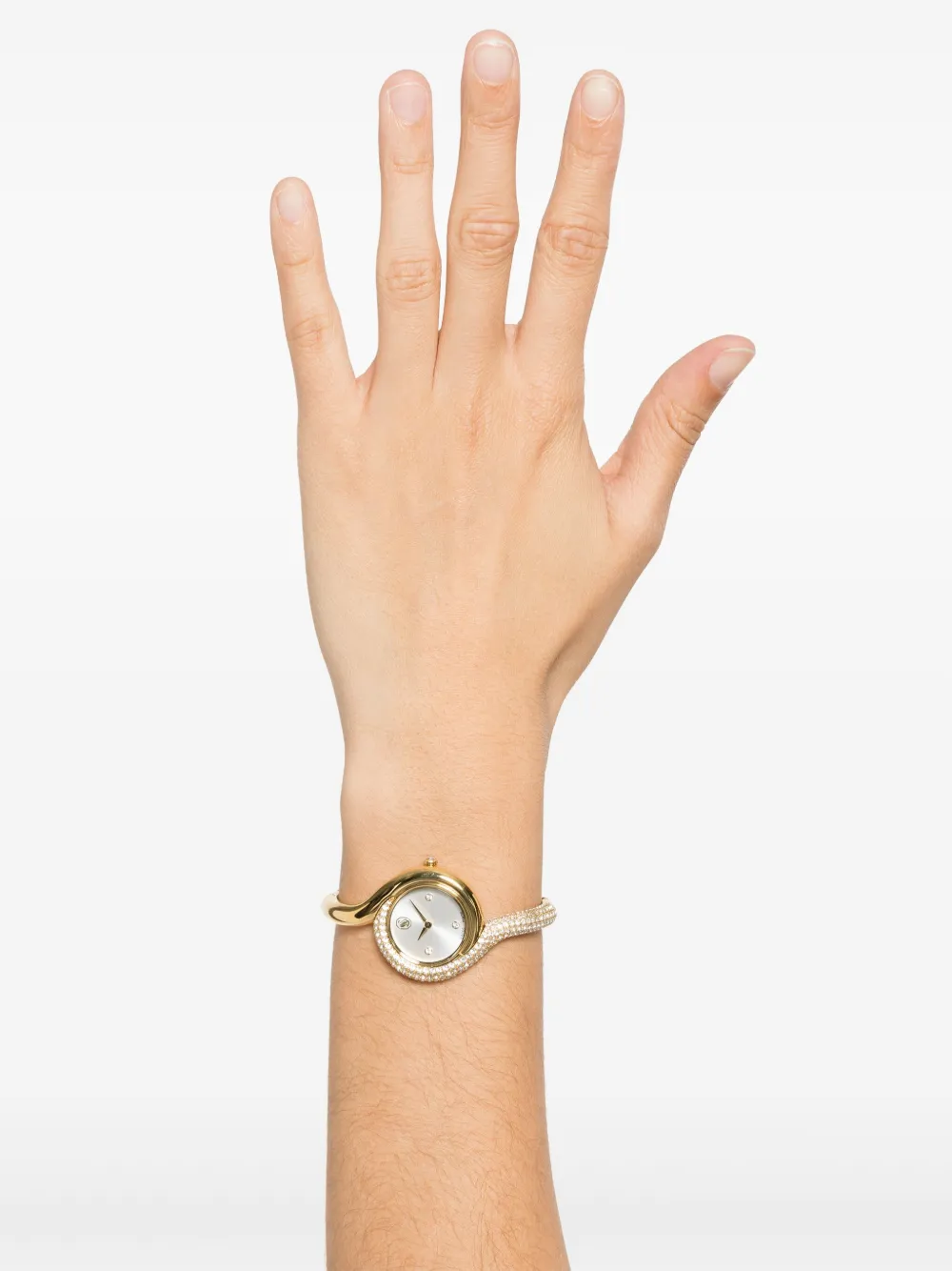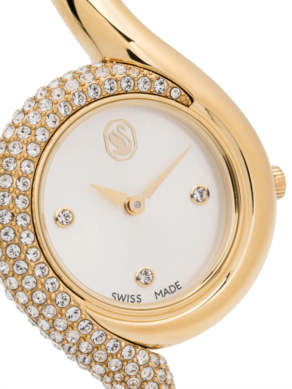 Подробнее о товаре: • нержавеющая сталь • кварцевый механизм • золотистый • асимметричный крой • круглый корпус • люминесцентный циферблат • мечевидные стрелки • аппликация в виде лебедя • завинчивающаяся заводная коронка • инкрустированный кристаллами безель • закрепка паве • отделка кристаллами Swarovski • браслет из нержавеющей стали • застежка-клипса • водонепроницаемость до 50 метров/5 АТМ