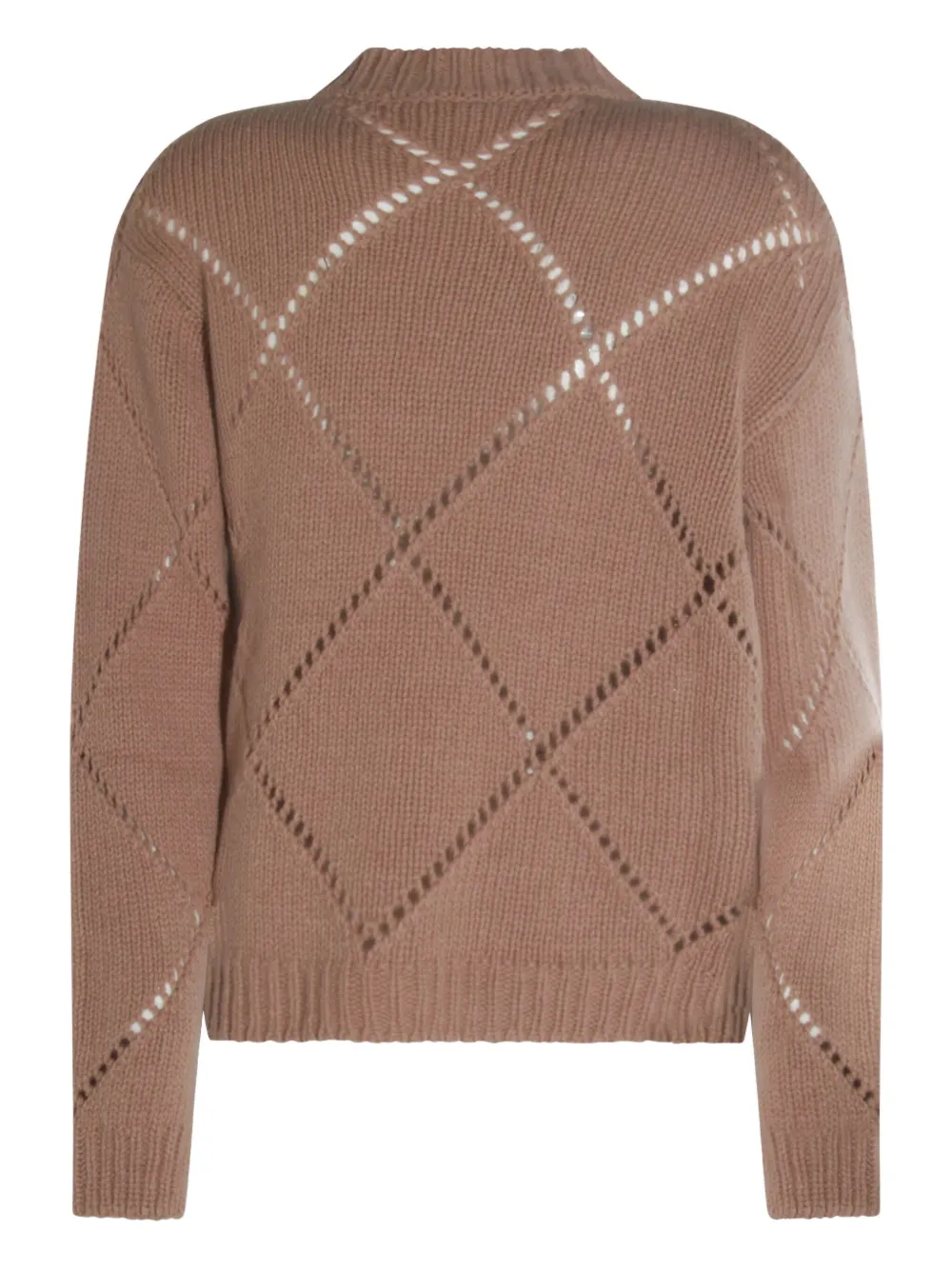 Коричневый ромбовидный узор, вырезы, круглый вырез, длинные рукава, ребристые манжеты.