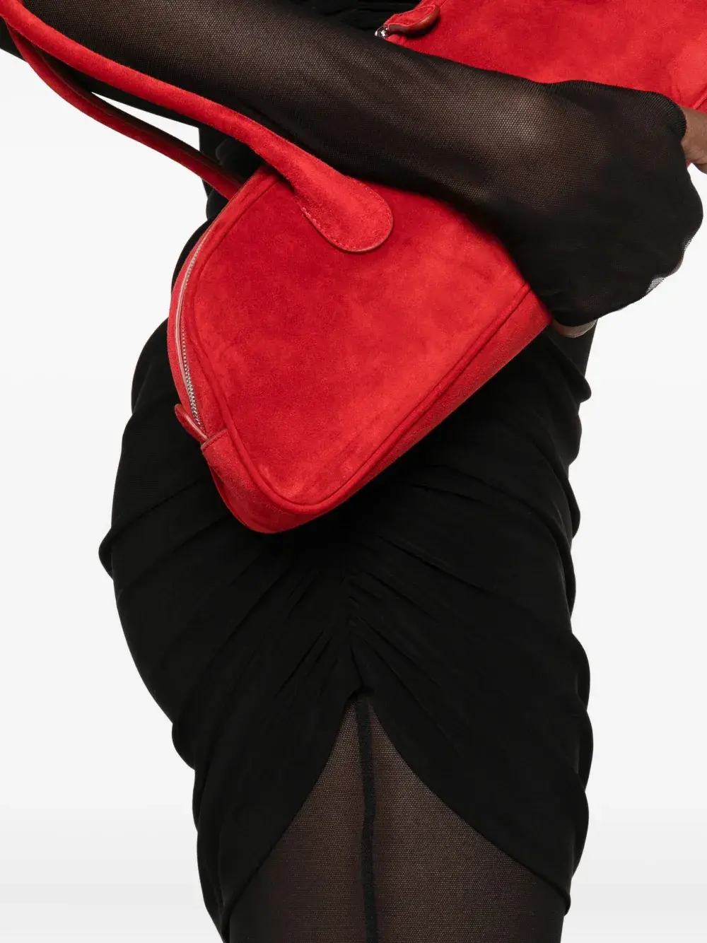 Черные сетчатые рукава, высокий ворот, асимметричный подол, длинные рукава, приталенный лиф.