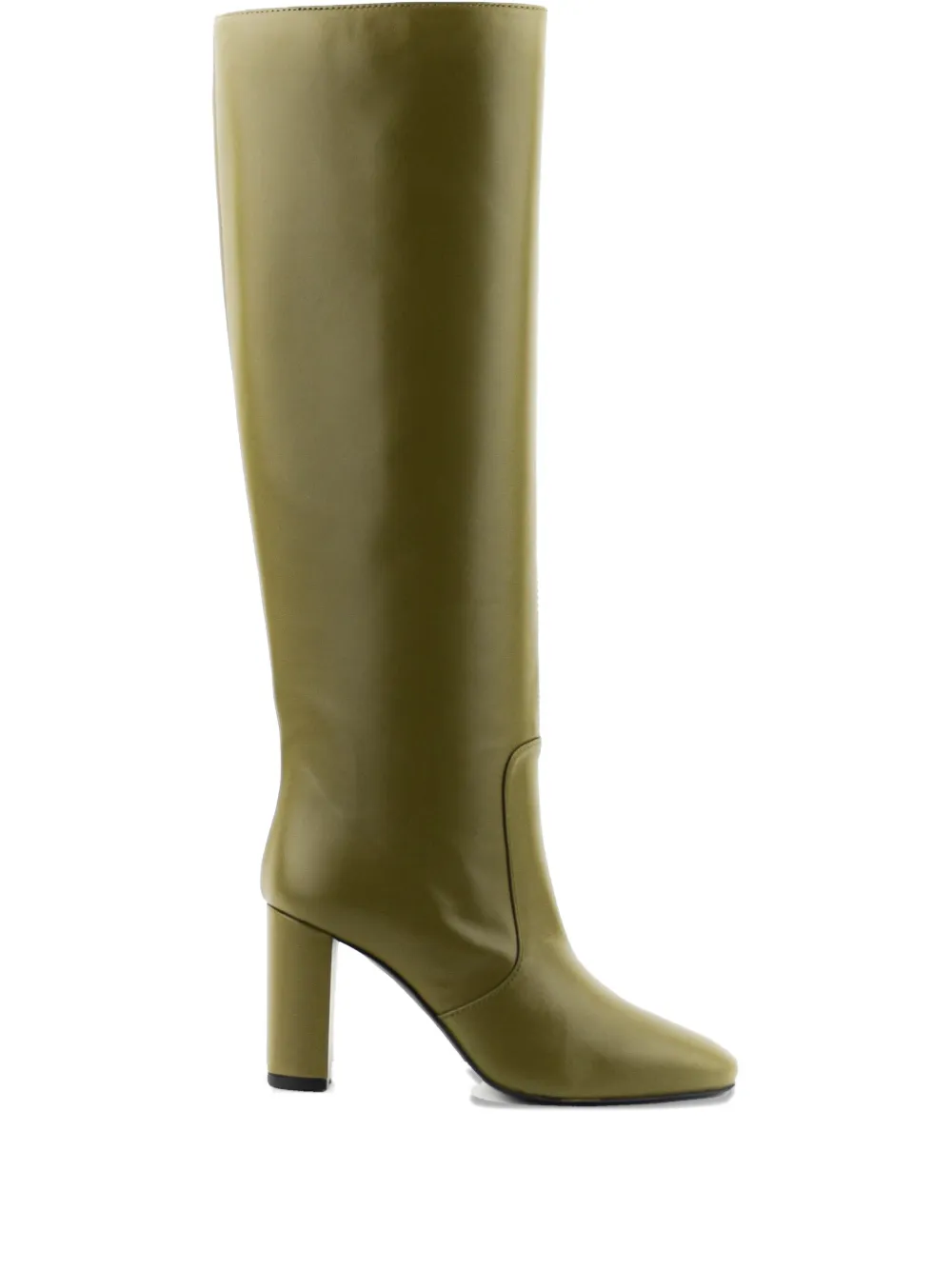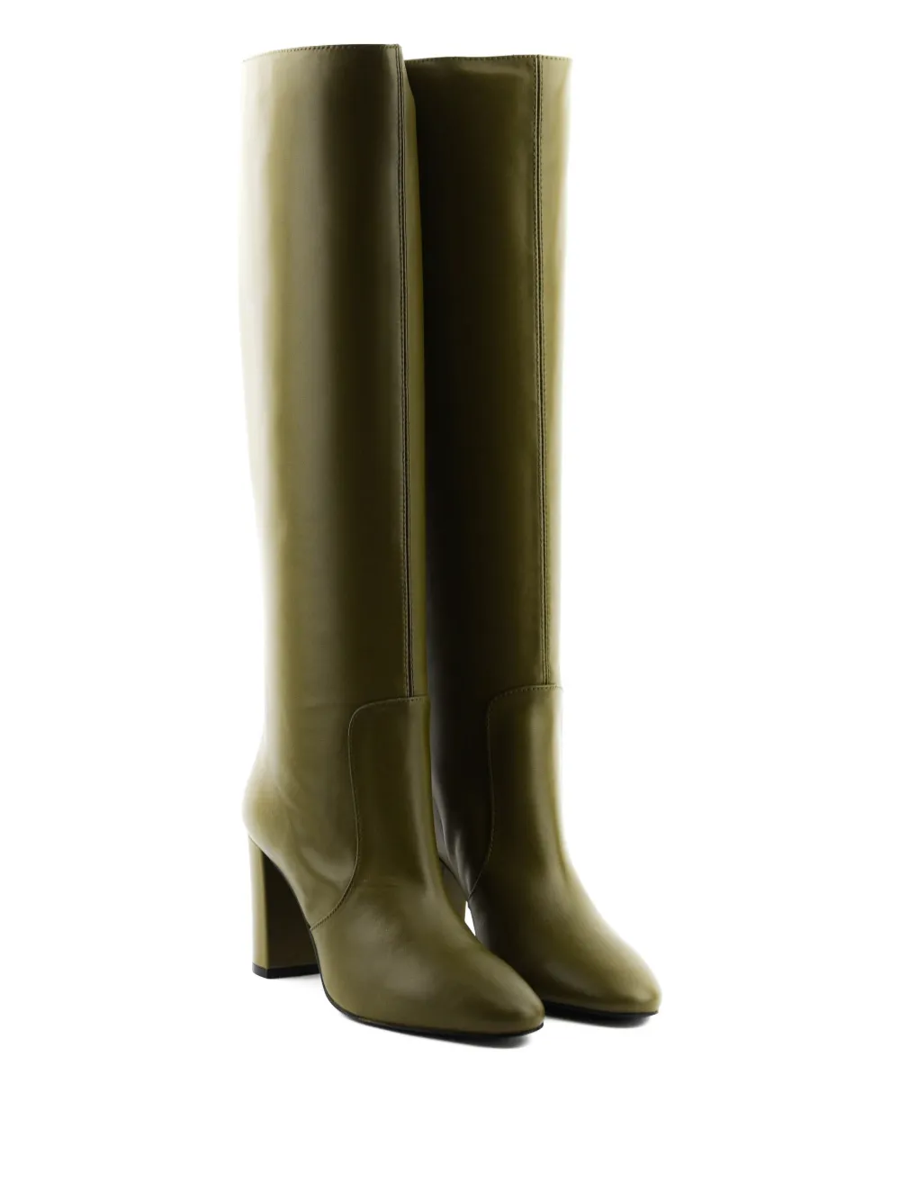 Туфли из натуральной кожи цвета хаки с блочным каблуком и миндалевидным носком, голенище выше колена, простой дизайн