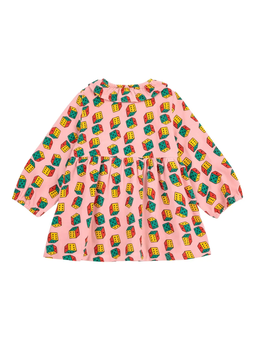 Ткань из розового микровельвета, принт «Игральные кости», застежка на пуговицы, воротник-оборка, длинные рукава.