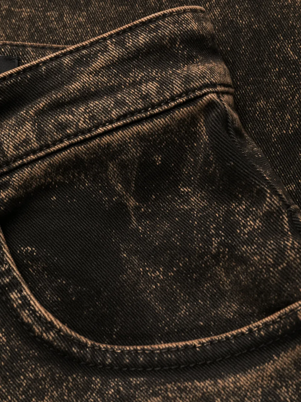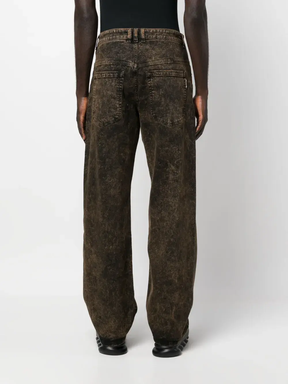 Черный, хлопок, эффект потертости, застежка на молнии и пуговице спереди, петли для ремня, два кармана по бокам, прямой крой и два накладных кармана сзади.