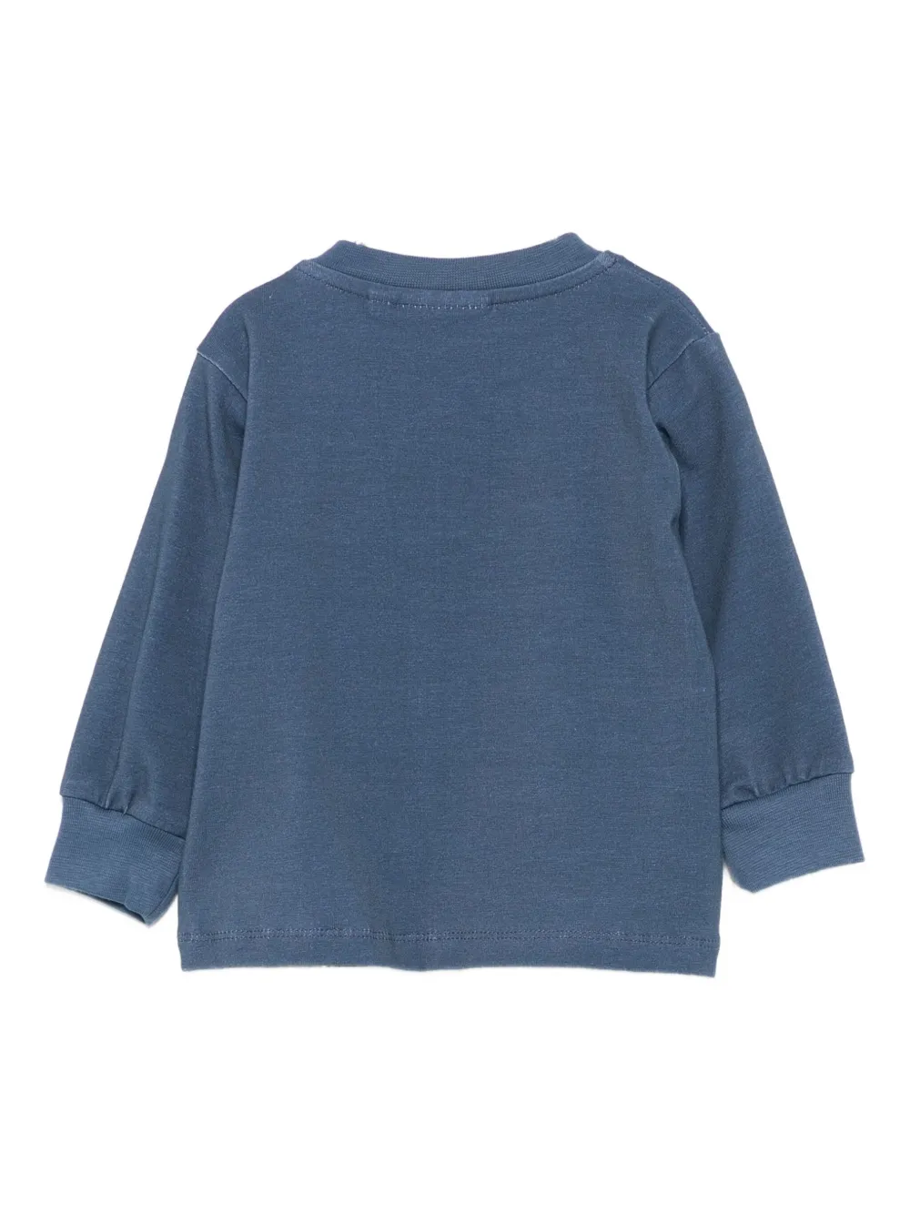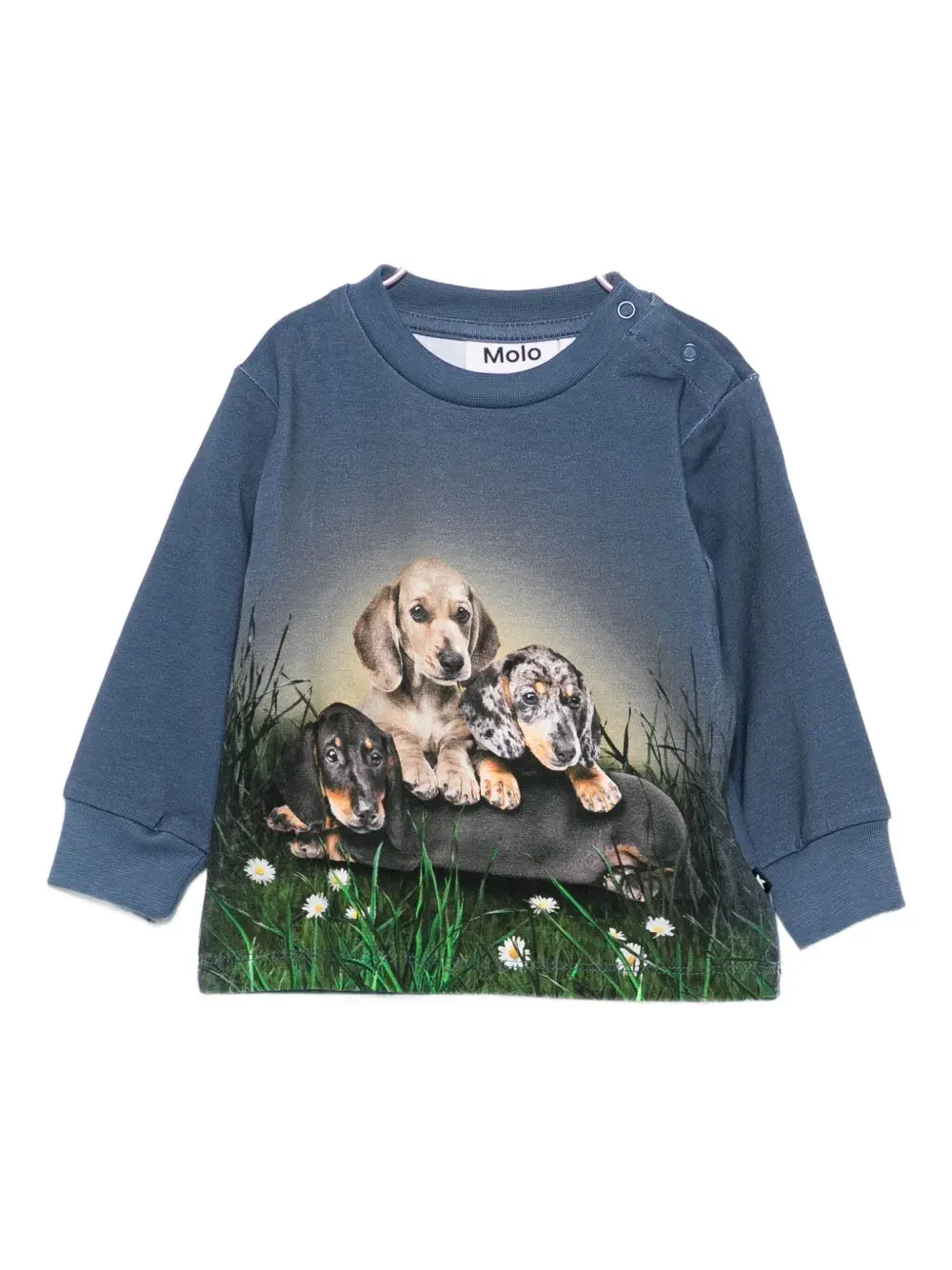 Графический принт с принтом собаки стального синего цвета, длинными рукавами и круглым вырезом.