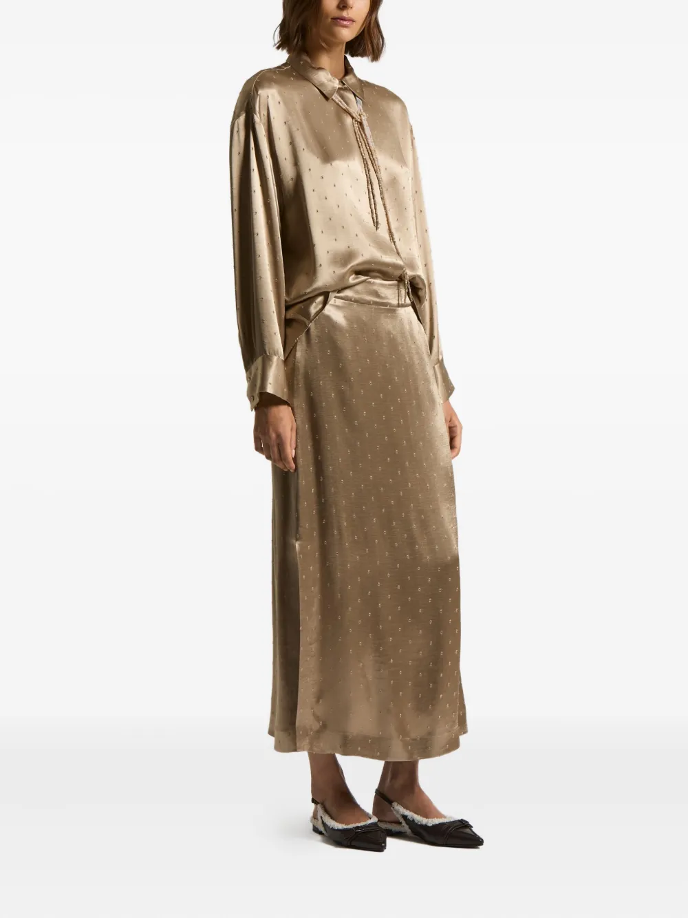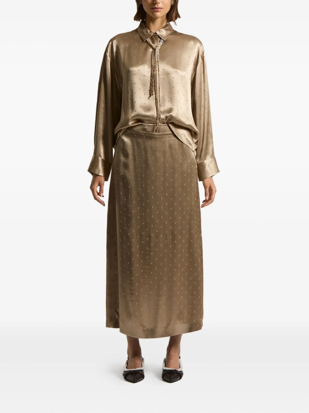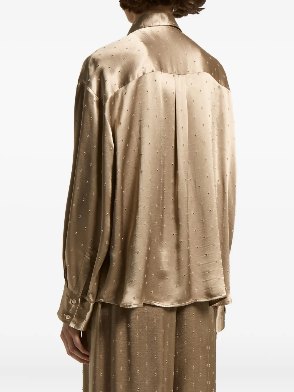 Золотистый узор в горошек цвета верблюжьей шерсти, воротник-стойка, длинные рукава, застежка на пуговицы.